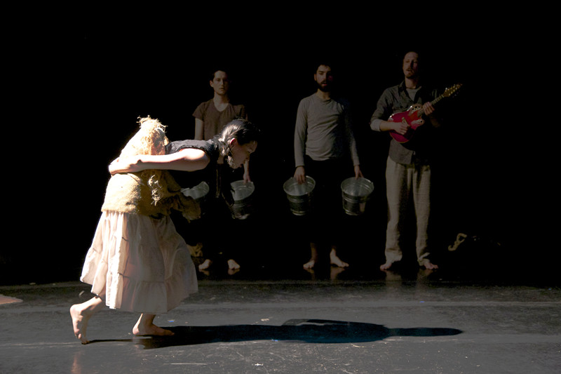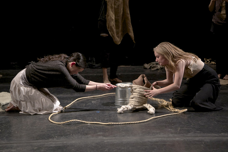 《高加索灰阑记》被称为是布莱希特剧作中最有诗情画意的作品,是布莱希特“叙事剧”理论最彻底的体现。剧中,说书人以优美的诗句叙述故事,具有强烈的艺术感染力。此次美国哥伦比亚大学愚人剧团的演出,由六位演员分别饰演六十个角色,演员们收放自如、默契十足。舞台上仅有的简单道具绳索、麻袋、毛毯、石块、铁桶等似乎不是任何东西,但其实它们却又可以是任何物品,通过抽象的表现方式、灵活的角色转换,观众们可以领略到舞台的无限可能性。