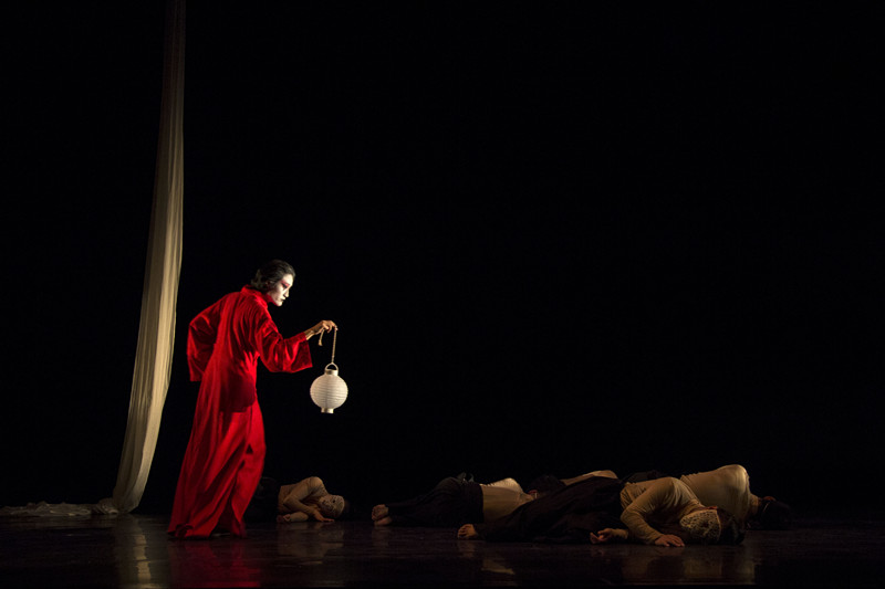 第一场的《陀螺》,从民间社戏中取材,以鲁迅名作《无常女吊》为蓝本,勾勒出一个如梦似幻,但又意味生长的二次元空间。戴着面具的人偶,杂技高难度的悬空,丝绸倾泻而下的华丽柔软,昆曲特有吊嗓子的唱腔,情绪化的处理方式。舞台上残忍凝视着一切的黑衣死神拿着佛龛,回荡着象征命运的��;禅理顿悟的陀螺玩家安静的自我欣赏,无尽旋转;男主角被无奈驯化后的不满,被大多数人排挤戏弄的愤懑;踢馆角力时候,开襟露腰的狂野释放;男女们动作一致机械木偶一样的僵硬呆滞;红衣女旦的妩媚与生死轮回;男主最后逃离挣扎的失败。都在陀螺寂寞的独舞中,与空气悲伤地擦肩里,化为一声声叹息,在不言中飘荡着压抑与困惑,让人不由得思索着,颤抖着。耳边仍是女旦的起凄婉“心无挂碍,远离颠倒梦想,究竟涅�?”