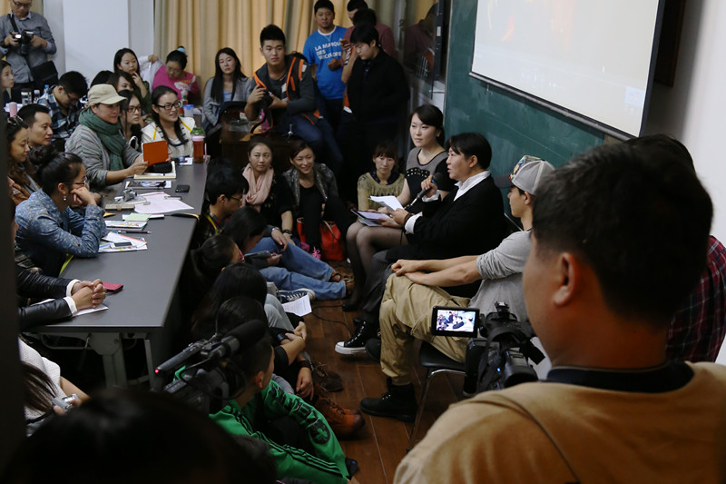 10月21日下午两点半,话剧《青蛇》的导演田沁鑫携《青蛇》剧组许仙的表演者董畅来到我校红楼206教室进行交流演讲。小小的教室里外挤满了人,其中不乏学生和社会上的戏剧爱好者以及各大媒体朋友,甚至连上戏的后勤工作阿姨都来到教室门口,即使站着也要听完整场讲座。从观众情况便可看出《青蛇》制作团队的受欢迎程度,好多观众在中午十二点之前就来到了教室等候,晚来的观众只能坐在地上、站在门外。门外的观众队伍也延伸到了206对面的教室,看不到人影的观众就只能静静地聆听田沁鑫导演的声音。