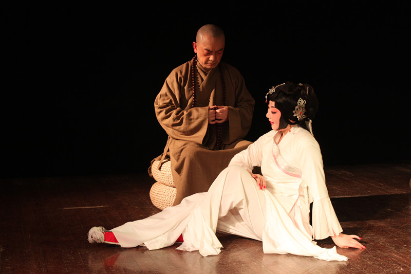在剧末,小沙弥说:“ 冷眼看人是禅?修养自身是禅?放纵是禅?克制是禅?超然是禅?心静是禅?风流是禅?压抑是禅?守节是禅?安贫乐道是禅?不求名利是禅?无忧无虑是禅?处变不惊是禅?万物无常是禅?”禅是什么,每个人心中自有答案。即是何为佛,你言便是。佛家忌讳的是执念。在放下和取得之间重新觅得了禅。小沙弥的这段话运用了传统戏曲中“显在”的叙述法。自报家门,抖露真相,得到了间离的效果,观众们可以独立于剧情,理性思考。