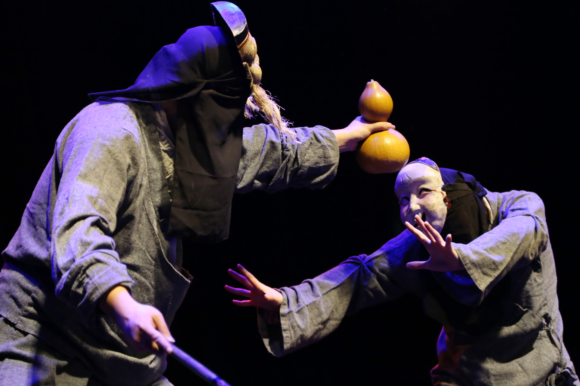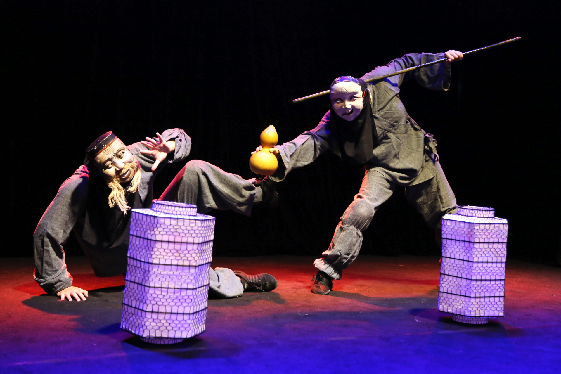 话剧讲述的是一个生活在河中的水鬼,为了离开河水投胎转世,只要能拉下一个落水者那么他就可以得到救赎。而今天,那个倒霉鬼出现了!主人公水鬼拿了一根木头看似是在钓鱼而却是在水下拉落水者。水鬼所佩戴着的老态的面具充满了复古而神秘的中国色彩。他与落水者之间的羁绊才是这个话剧的主旨。他们共同饮酒、嬉戏。看似悲惨的故事却被他们之间的情感所改变。也许这是值得庆幸的事,他们遇到了能把酒同欢的知己,遇到了外表不同但却拥有相近灵魂的人。他们用饮酒的欢乐来感叹这浮华世界的喧嚣,他们做到了栖居在这个乐土上,尽管只是一瞬。丰富的肢体语言和舞蹈表演再加上绳子舞和红旗舞形象地表达出他们面对这个世界的无奈。最后那一幕,在优美的音乐中观众突然被一声剧烈的吼叫所惊吓到,直接把我们从优美的天堂拉到了人间地狱!直指人心。