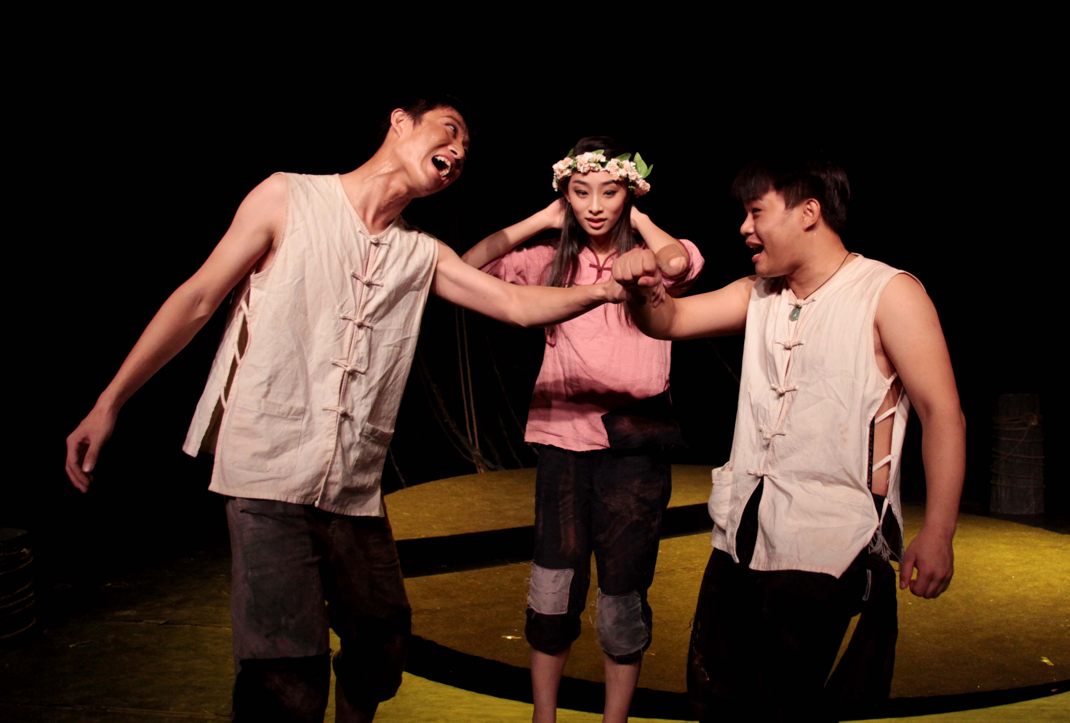 毕业作品《蛾》是由我校12级导演系艺术硕士韩易默导演,12级表演系艺术硕士张欣凌、12级导演系本科刘梦扬、10级导演系本科许亮主演,韩雪松老师指导。该剧讲述了两兄弟大、二在河上救起了险些被洪水淹死的少女蛾,此后三人生活在一起并发生的感情故事。大、二都想拥有蛾,最终他们以抛硬币的方式决定了大娶蛾为妻。但蛾并不喜欢年纪同她爹一般,灵魂干瘪的只有传宗接代观念的大。她更倾慕于能给她讲美丽的传说,唱动人曲调满足她精神需求的二。故事发展至高潮,蛾勇敢地向二表达内心的情感希望二带她去追寻传说中的天地。最后大离开了,二无力付诸行动去实现蛾的愿望,绝望的蛾只能独自追寻她渴求的“太阳”。结局以飞蛾扑火的意味表达了剧作主旨,引人深思,意味悠长。