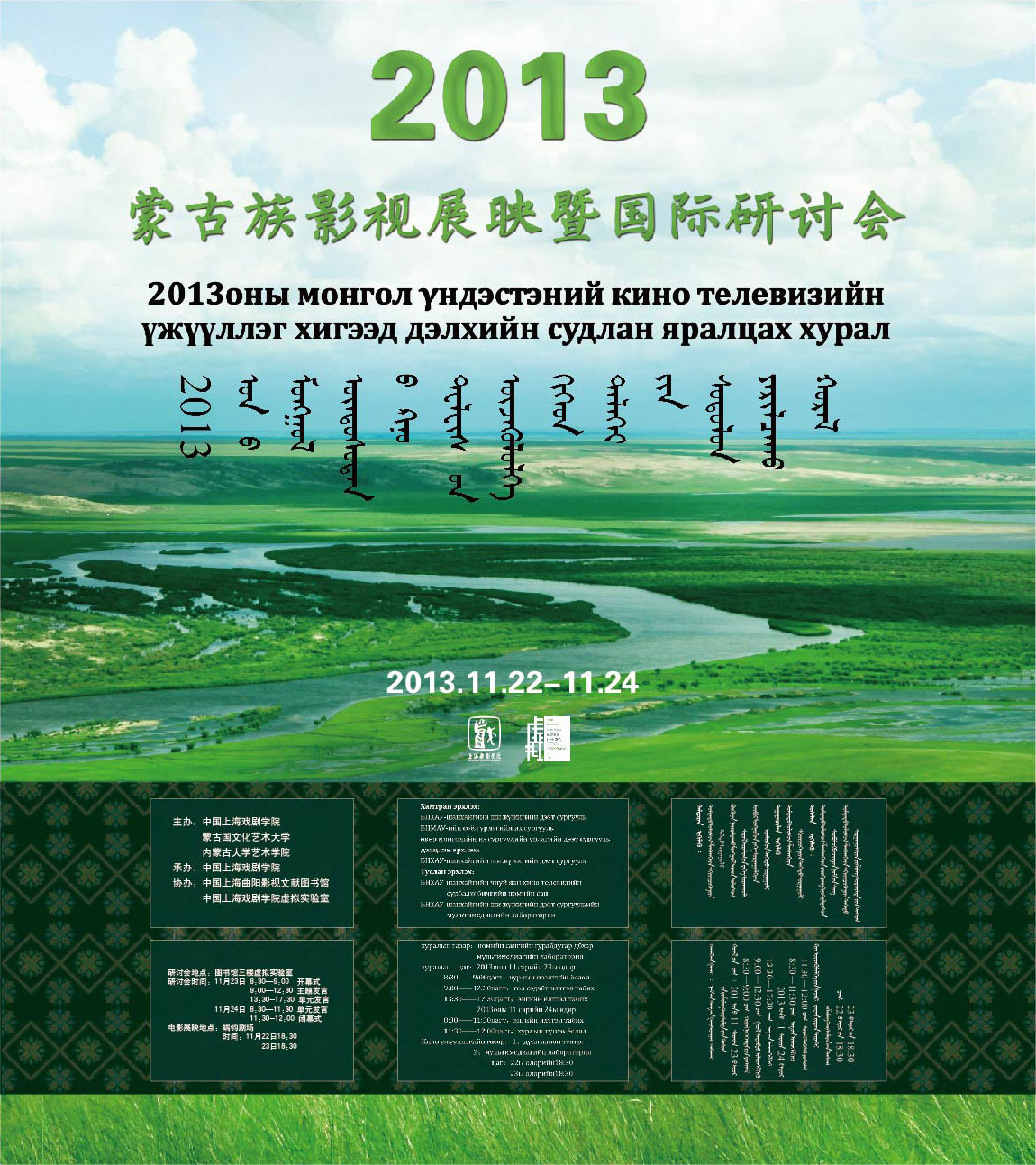 蒙古国文化艺术大学由副校长刚琪琪格带队,电影戏剧学院院长、广播电视学院院长和八位专家来沪参加此次盛会。内蒙古大学艺术学院、内蒙古师范大学等十位教授专家也到达上海,光临我院。他们跟我校和上海的著名专家一起,共同对蒙古族影视的历史发展与未来趋势进行深入的探讨。此次会议是中国首次举办的高层次学术盛会,具有开拓性的意义。