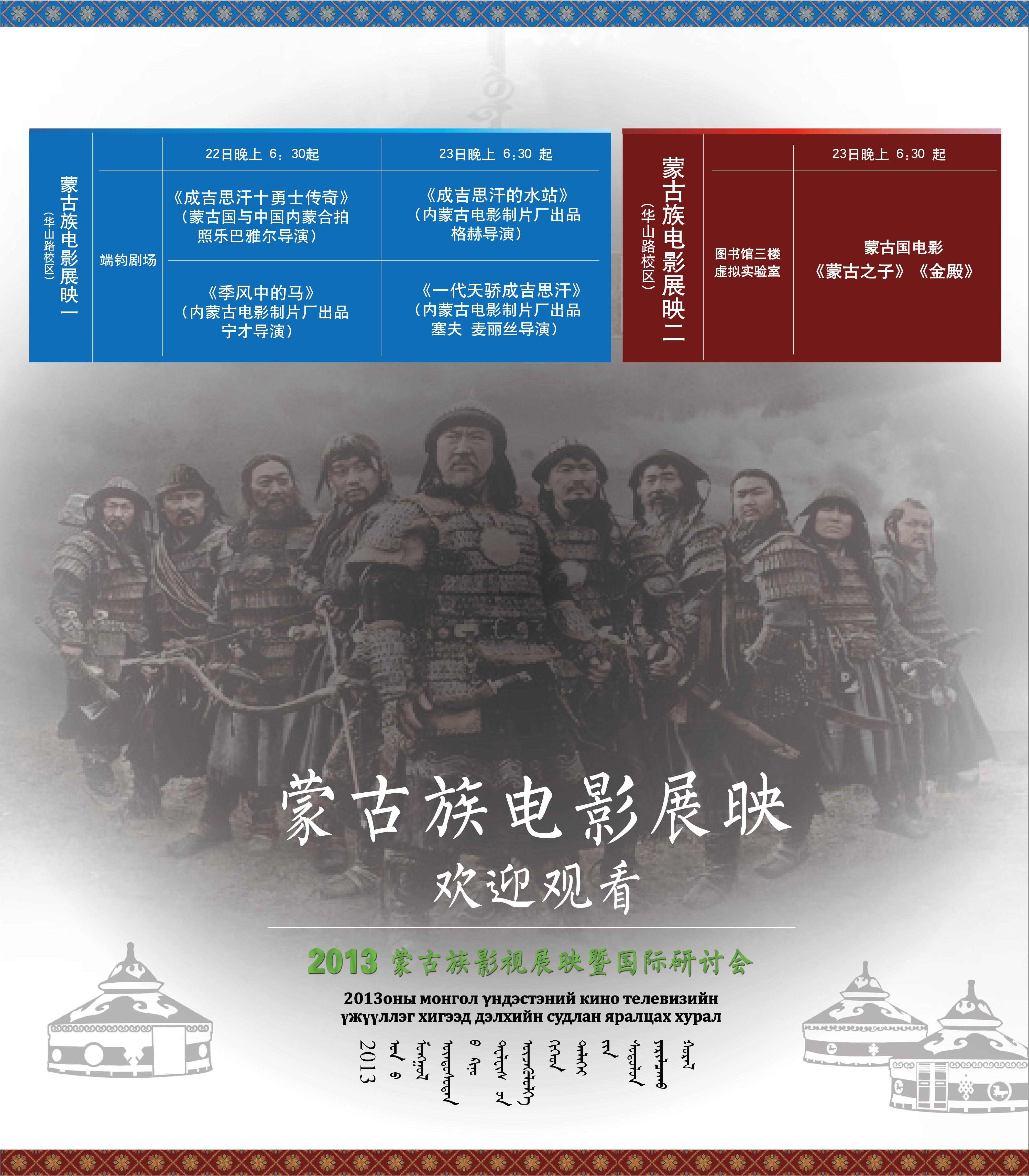 会议期间,将在端钧剧场和虚拟实验室放映蒙古国和内蒙电影共六部。它们是:获得奥斯卡最佳外语片提名的《一代天骄成吉思汗》、我校校友、著名导演宁才的得奖作品《季风中的马》、富有蒙古民族风格的《成吉思汗水站》。本次展映还将放映蒙古国与内蒙合拍的新片《成吉思汗十勇士》。展映的蒙古国第一部故事片《蒙古之子》具有历史价值。还有反映蒙古国人民生活真情的《金殿》。蒙古族电影较为集中的放映对我校师生了解蒙古族电影艺术,加强艺术交流将起到积极的推动作用。(文:宗燕 编辑:一品)