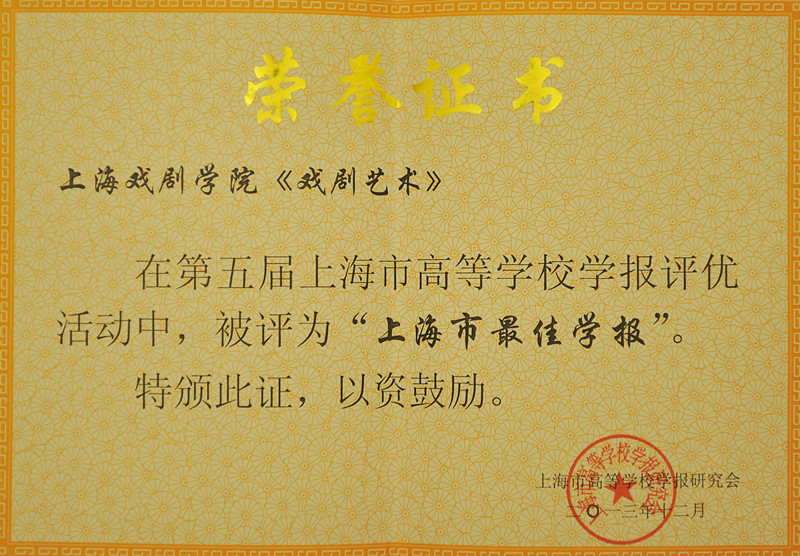 日前,在第五届上海市高等学校学报评优活动中,由我校编辑出版的《戏剧艺术》被评为“上海市最佳学报”。(文、编辑:榕树 图:佳奇)
