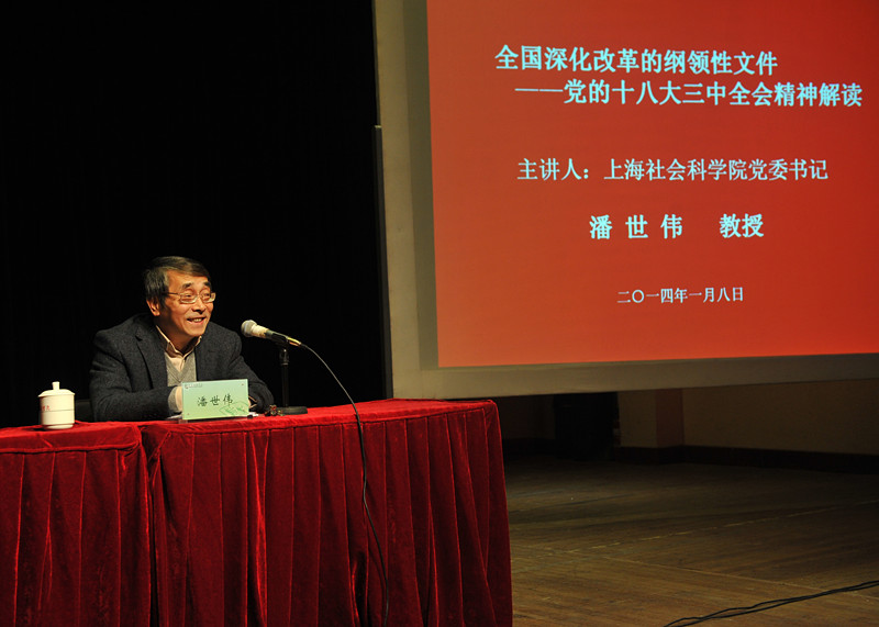 1月8日下午,上海社会科学院党委书记潘世伟同志在我校新空间剧场为中心组成员作十八届三中全会精神辅导报告。党委书记楼巍主持报告会,校领导和全体中层干部共计六十余人出席会议。