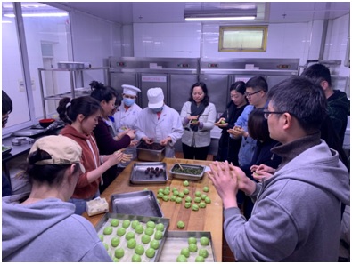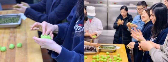 在食堂内,大家兴趣盎然地捻青、揉粉、搓馅、抹油,看似简单实则不易。在食堂“老师傅”们的耐心指点下,参与活动的老师们认真倾听,小心翼翼地动手。在一片欢声笑语中,一个个油绿如玉、糯韧绵软的青团最终出炉。大家还制作了马兰头馅的青团,共尝初春滋味。
