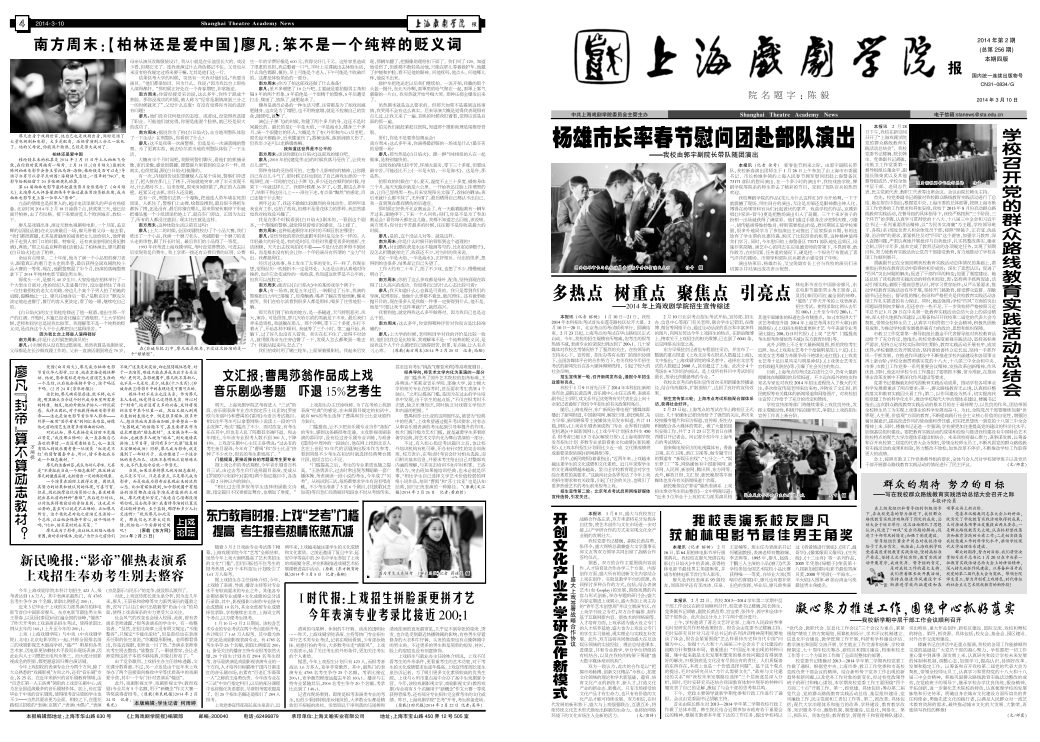 《上海戏剧学院报》2014年第2期(总第256期)已于2014年3月10日出版,本期共四版。重点内容有:《杨雄市长率春节慰问团赴部队演出——我校由郭宇副院长带队随团演出》、《多热点 树重点 聚焦点 引亮点——2014年上海戏剧学院招生宣传综述》、《学校召开党的群众路线教育实践活动总结会》、《我校表演系校友廖凡获柏林电影节最佳男主角奖》等,敬请关注,也可点击下载阅读。(文、图、编辑:榕树)