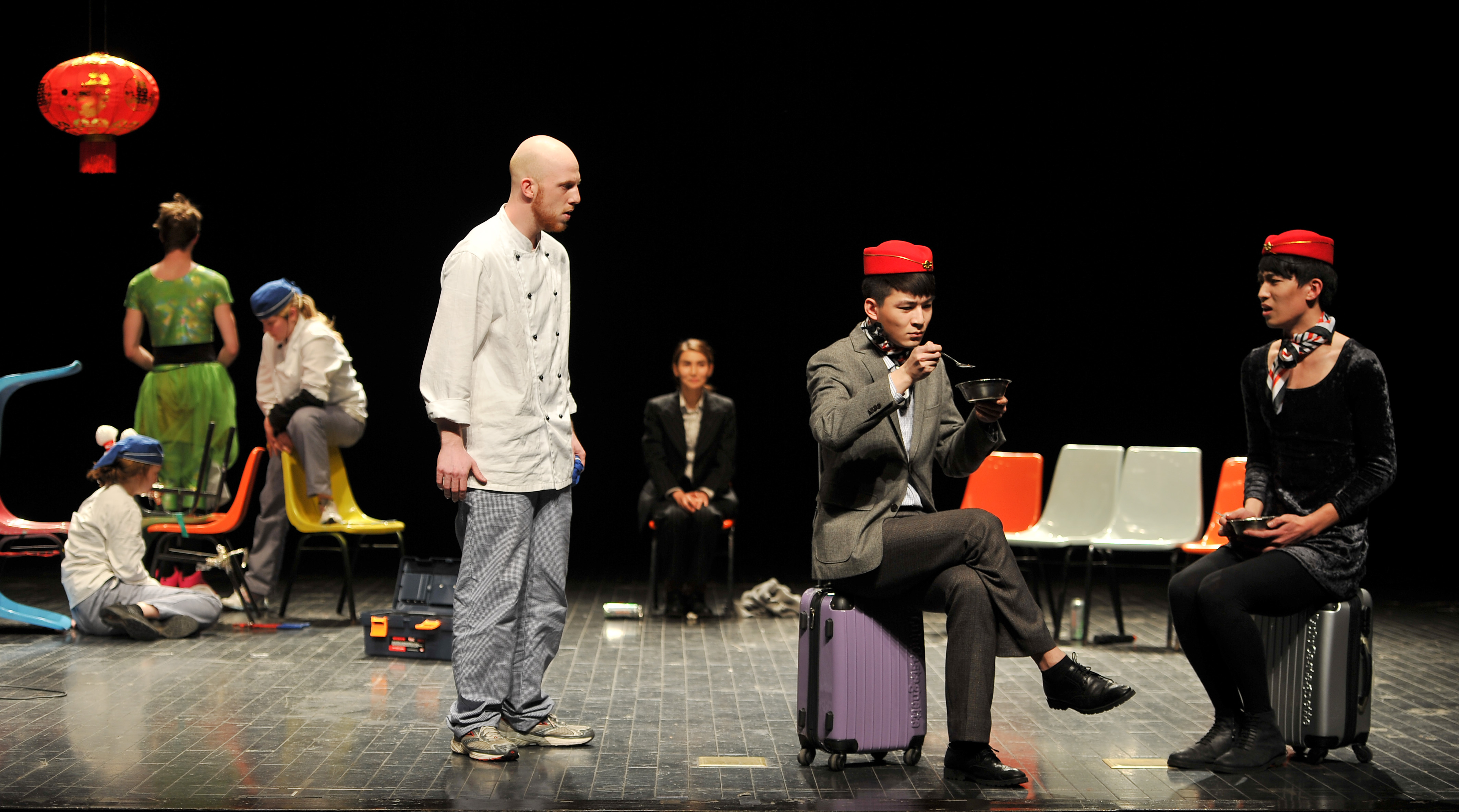 《金龙》舞美设计极为简单,几把椅子拼起来便营造出金龙餐厅逼仄的环境。演员不断通过椅子的组合来凸显出不同的演区。演出过程中没有演员上下场,场景更换灵动,演员在不同情境中快速腾挪表演,这样的表现形式正顺应了全场48个场景的需要。柏林Bat实验剧场很适合演出这类实验性作品,每场演出观众都气氛热烈,给予演员许多正向的回应,演员也在观众的刺激下,越发演得投入放松,并有许多精彩的即兴表演。
