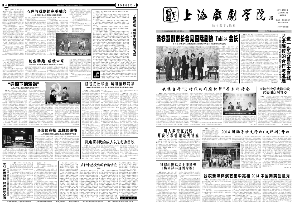 《上海戏剧学院报》2014年第6期(总第260期)已于2014年6月5日出版,本期共四版。重点内容有:《翁铁慧副市长会见国际剧协Tobias会长》、《第七届联合国教科文组织国际剧协亚太局校长会议顺利召开》、《我校召开“E时代的戏剧批评”学术研讨会》、《南加州大学戏剧学院代表团访问我校》等。本期第二版为“亚太局”专版,第三版为“上戏有戏”专版。敬请关注,也可点击下载阅读。(文、图、编辑:榕树)