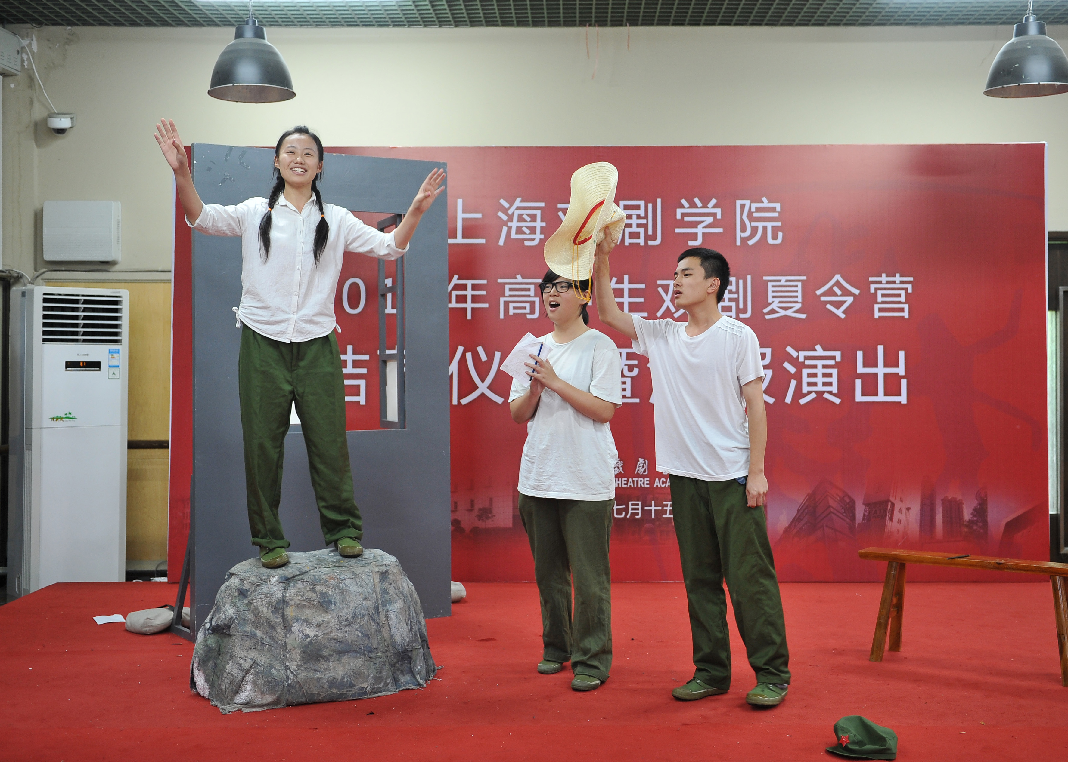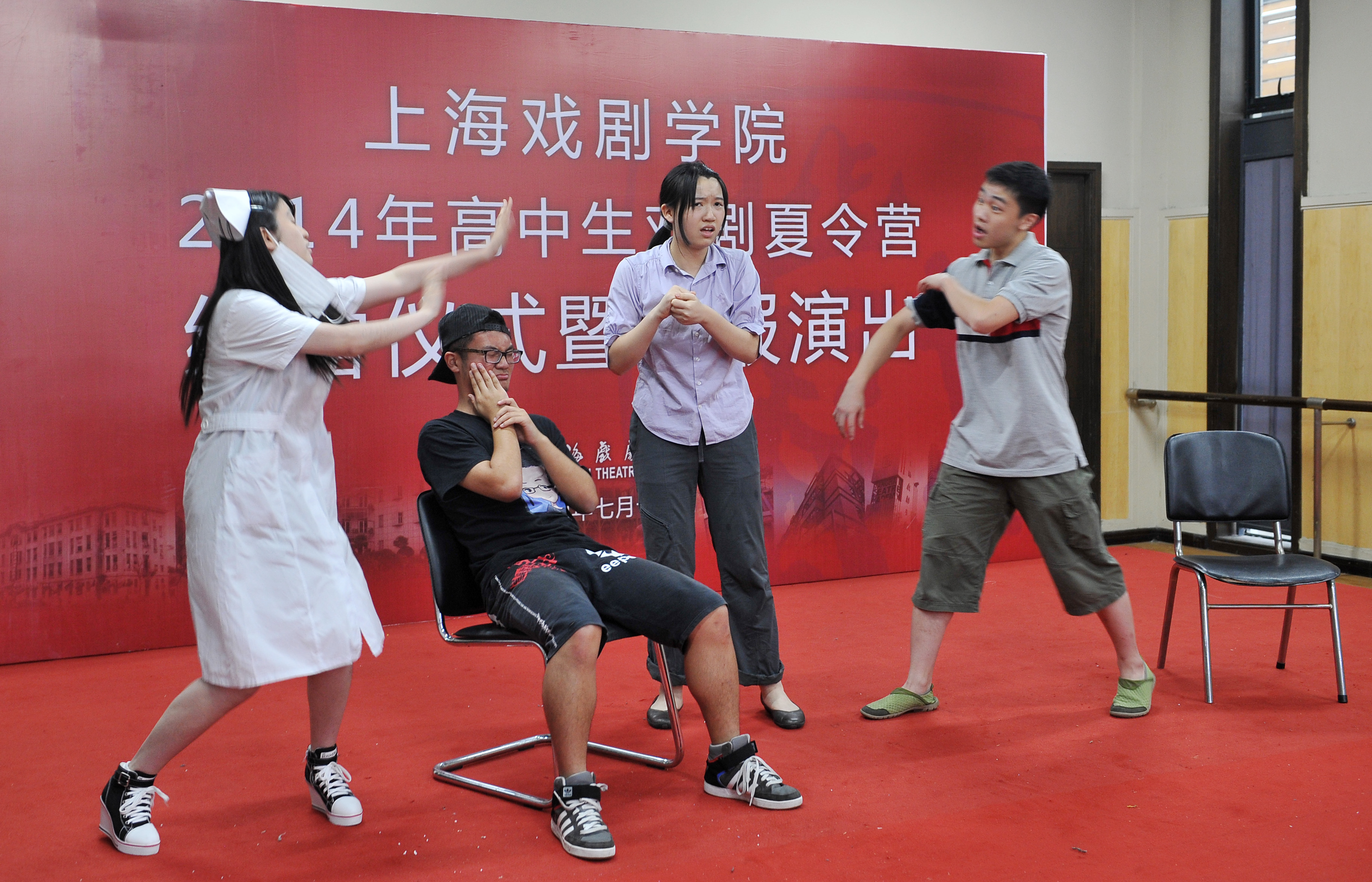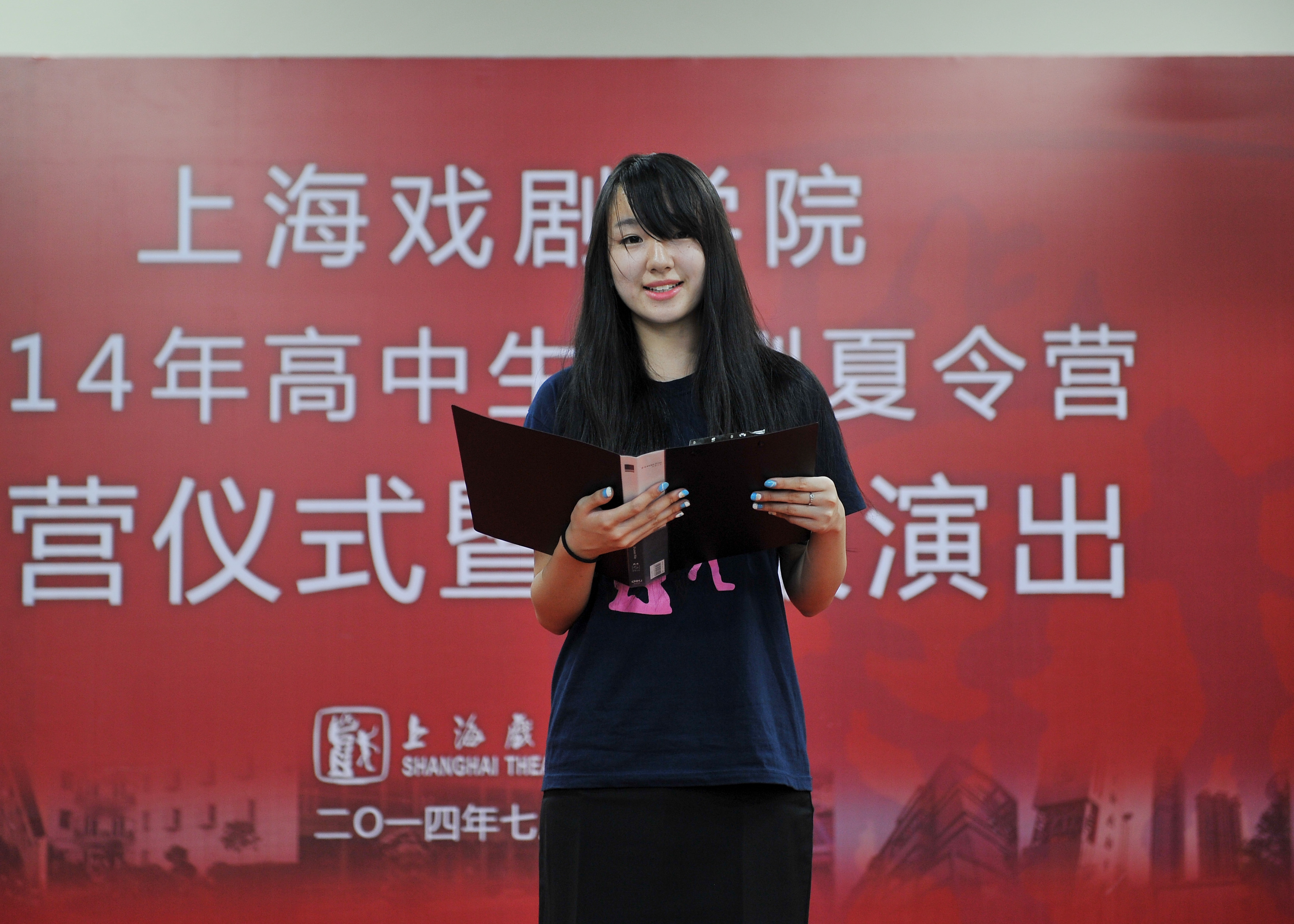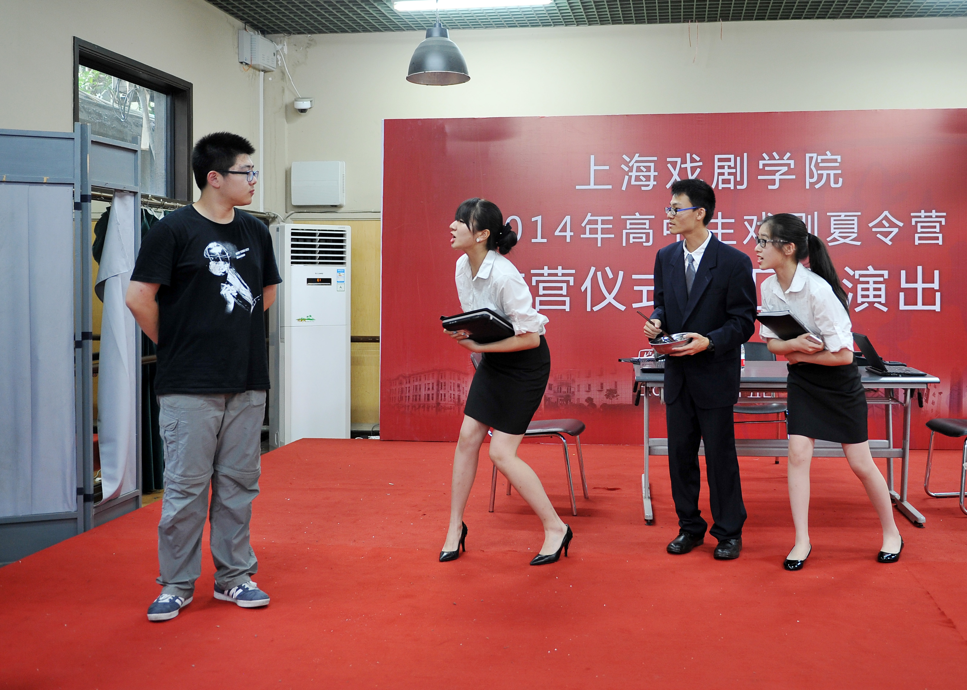 7月15日下午,“2014年上海市高中生戏剧夏令营”结营仪式暨汇报演出在一号形体房顺利举行。我校党委副书记胡敏,上海市教委体卫艺科处赵靖茹副处长及蒋萍芳老师,团委书记、学工部副部长陈云,表演系教授范益松、糜曾,复旦附中党委副书记李峻,延安中学党委书记马越,北虹中学校长张峻,以及来自格致中学、向明中学等重点高中的教师代表和学员家长代表共同出席了本次活动。活动由此次夏令营的学员王融融和袁颖杰主持。
