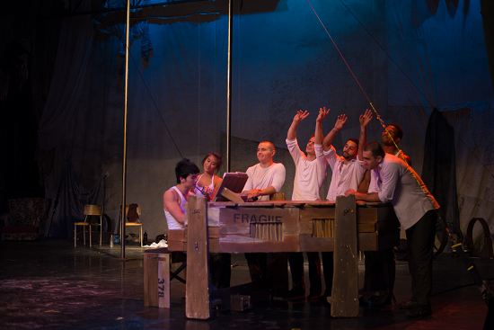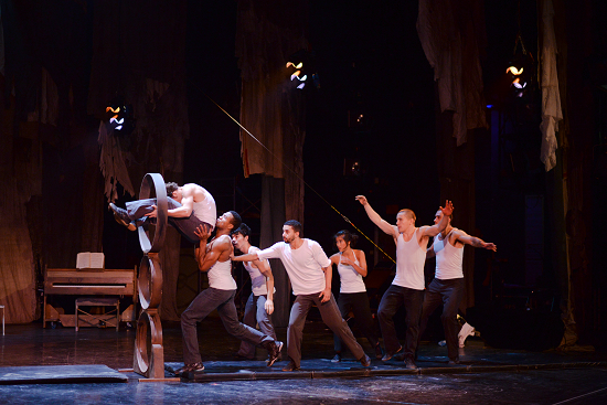 他们在地上撒白色粉末,演员在舞台上赤脚行走,只有一个女演员,虽然个子矮小但是十分灵活,高壮的男演员用一只手就能把女演员举起,女演员单脚站在男演员的手掌上,在高空也是脊梁笔挺毫不畏惧,男演员可以把女演员抛向空中转几个圈却仍然稳稳接住。