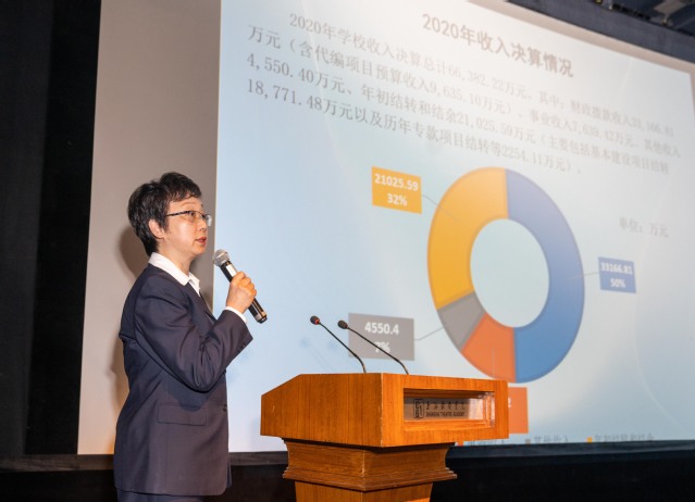 总会计师张佳春同志作《2020年度上海戏剧学院财务决算方案及2021年财务预算方案》工作报告,向全体代表报告了学院2020年财务决算情况、财务工作成效,主要介绍了2020年学校在经费非常紧张的情况下,汇聚各方面资源保障教学,还汇报了2021年预算方案、财务重点工作,要有所为、有所不为,确保人才培养的质量。