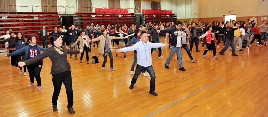 在胡敏副书记宣布运动会开幕后,在公教部万燕老师带领下,校领导和教师齐做广播操,展现了我校教职工积极健康向上的精神风貌,同时也为即将开始的运动会比赛热身。