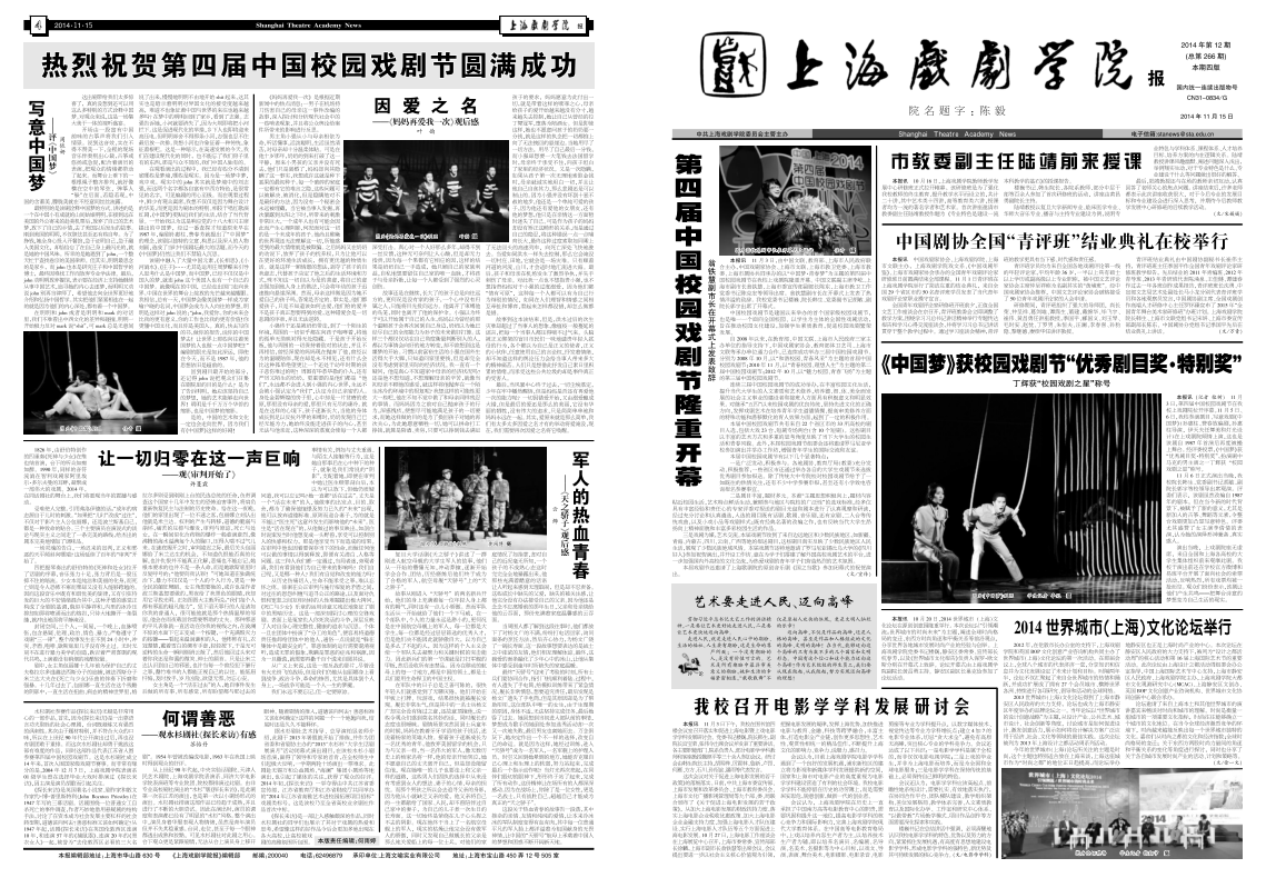 《上海戏剧学院报》2014年第12期(总第266期)已于2014年11月15日出版,本期共四版。重点内容有:《第四届中国校园戏剧节隆重开幕 翁铁慧副市长在开幕式上发表致辞》、《<中国梦>获校园戏剧节“优秀剧目奖•特别奖” 丁辉获“校园戏剧之星”称号》、《市教委副主任陆靖前来授课》、《中国剧协全国“青评班”结业典礼在校举行》等。敬请关注,也可点击下载阅读。(文、图、编辑:榕树)