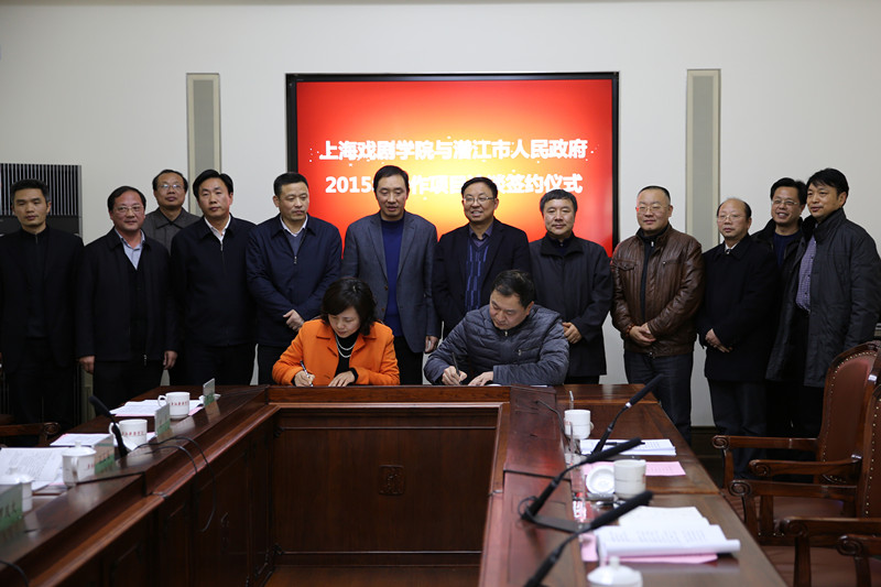 双方领导回顾了几年来的友好合作交流情况,对未来校地合作充满期待并就2015年具体合作项目进行了商讨,双方本着资源共享、优势互补的原则,以已签署的《上海戏剧学院与潜江市人民政府战略合作意向书》和《关于推进校地合作 支持潜江文化产业发展的合作协议书》为指导,决定就此前磋商的合作项目达成如下具体意向:一、文化交流和学术研究:在纪念抗日战争胜利70周年之际,以“曹禺戏剧文化”为主题,举办一次联合精品文物展;上戏派专家对潜江曹禺纪念馆进行展览提升的指导工作,编制展陈大纲;湖北省花鼓戏艺术研究院和我校互派专家教授进行交流讲座。二、为江汉职院、湖北省花鼓剧院培养人才和师资队伍:培训灯光师、音响师、舞蹈编导、音乐创作人员,接收花鼓剧院戏曲导演、舞蹈编导人员来我校学习深造,为花鼓剧团培养1-2名本科学历专业人员;江汉职院与我校在学历教育(中专、成教本科)、社会培训(考前、职后)等方面开展合作;三、江汉职院聘请我校舞蹈表演、音乐表演、艺术设计等专业的3名学科带头人担任专业建设指导教师,并申报“楚天技能名师”岗位。