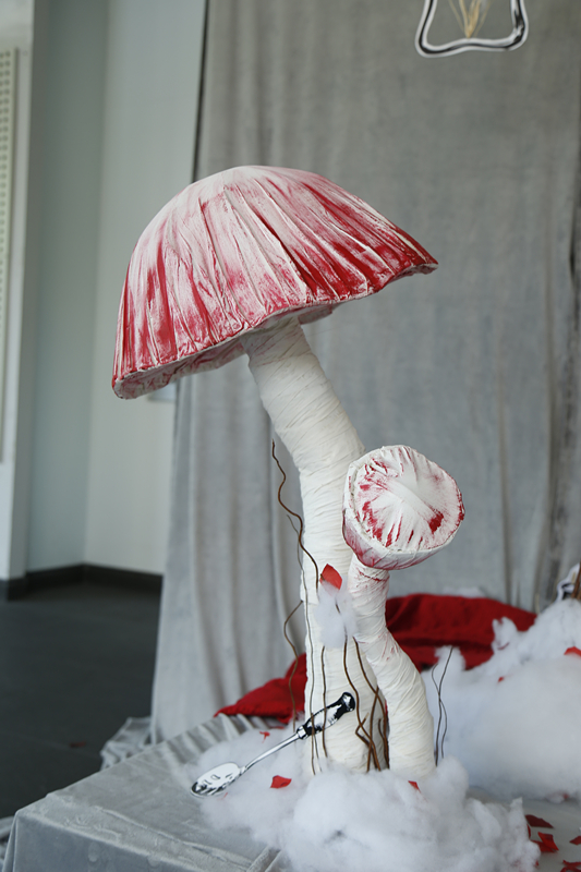 此次服化展的指导老师潘健华老师说,“爱丽丝”这个主题比较适合全班同学共同完成。这部剧里的角色都很有自己的特点,很有戏剧性。与舞美系的另一个教学品牌《着色》不同的是,这不是时尚秀,而是与上戏的特色息息相关、与戏剧舞台紧密联系、适合在舞台上去造型表现。此次服化展另一大特色在于,全都是利用特种材料来进行服装造型的创意,整体的设计意图是通过浪漫而富有幻想的结构形态来展现不同角色的人物特点,从中也体现了上戏舞美系学生不拘一格,勇于探索的传统精神。
