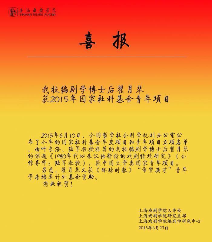 我校博士后翟月琴获2015年国家社科基金青年项目