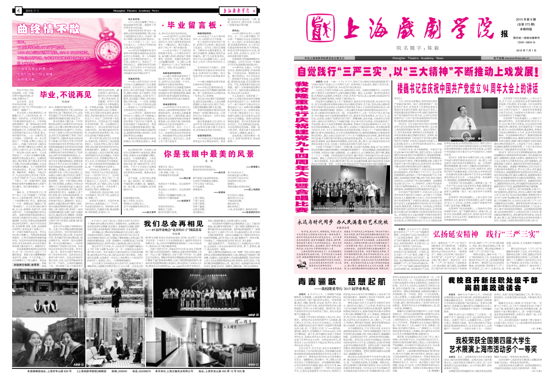 《上海戏剧学院报》2015年第6期(总第273期)已于2015年7月1日出版,本期套红,共四版。重点内容有:《我校隆重举行庆祝建党九十四周年大会暨合唱比赛》、《楼巍书记在庆祝中国共产党成立94周年大会上的讲话》、《弘扬延安精神 践行“三严三实”》、《青春骊歌 梦想起航——我校隆重举行2015届毕业典礼》等。敬请关注,也可点击下载阅读。(文、图、编辑:榕树)