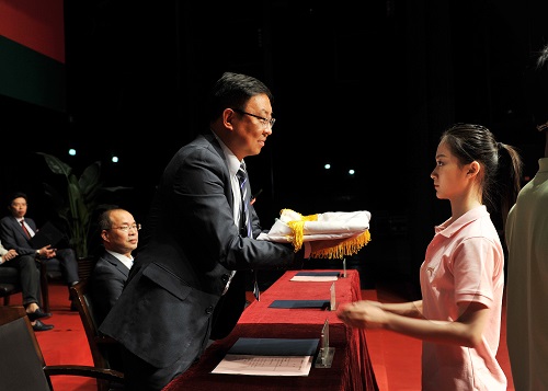 最后,典礼进行了校旗传接仪式。在催人奋进的校歌声中,党委书记楼巍将校旗从老生代表手中传递给新生代表,2015级新生全体起立,面向这面承载了梦想与使命的校旗郑重宣誓,慷慨激昂的宣誓声回荡在上戏剧院,表达了15级新生对大学生活的无限向往和对艺术的执着追求。最后,全体师生起立共唱校歌,典礼在在舒缓庄重的氛围中落下帷幕。(文:国强 图:佳奇 编辑:榕树)