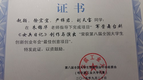 作为2015年上海市大学生创新项目、2014年上海戏剧学院“啄壳”项目、上海戏剧学院创作中心支持剧目,原创舞台剧《女兵日记》根据编剧赵颖真实军营经历创作,通过“日记体”的叙述形式,采用原创歌舞和话剧结合的方式,讲述了四个90后大学生女兵为主的文艺兵们怀揣个人理想,在军营摸爬滚打、最终蜕变的励志青春。该剧首演于上戏新空间剧场,并先后于2014年第二届乌镇国际艺术节、2015年首届京港青年舞台艺术节、2015年第十四届北京大学生戏剧节等参加展演。组委会专家对我校结合当今时代特征与社会现状进行校园戏剧创作的创新精神给予肯定,对我校创新项目和展板设计给予表扬,认为我校创新项目思路新颖,实践操作扎实,成果显著,在展板设计方面也颇有特色,最终,我校创新项目“原创舞台剧《女兵日记》”收获“最佳创意项目”和“我最喜爱的项目”两项大奖。