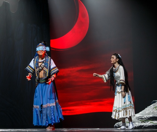 尾声“化石”与越剧《梁祝》的结尾“化蝶”,有异曲同工之妙。因为来自云南,阿诗玛与阿黑的爱情自然不同于江浙“梁祝”的柔婉,而是爱得更直白、更狂野。面对封建势力的压迫,三个年轻人为了爱情做出了自己的选择:阿诗玛最终化为神女峰。她诞生于石林又回归,最后变为石头的雕像。阿支刺瞎自己双眼,也化为守护峰,紧紧地护卫着神女峰;阿黑为了永远陪伴阿诗玛,一生独守在石林中。剧终,石峰冉冉升起,阿黑深情呼唤着阿诗玛,三个年轻人对爱的执著,浪漫地呈现在舞台上。音乐剧最大的诗化在于此。