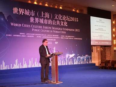 人民网上海10月20日电 10月19日,“2015世界城市(上海)文化论坛”在上海静安举办,今年论坛的主题为“世界城市的公共文化”。大会由上海戏剧学院副院长、世界城市文化协同创新中心主任黄昌勇教授主持,上海市文广影视局副局长贝兆健、上海戏剧学院党委书记楼巍以及世界城市文化论坛秘书长、英国BOP文化创意产业咨询公司总裁Paul Owens出席开幕式并致辞,联合国教科文组织国际戏剧协会总干事托比亚斯·比昂科尼做开幕主旨演讲。