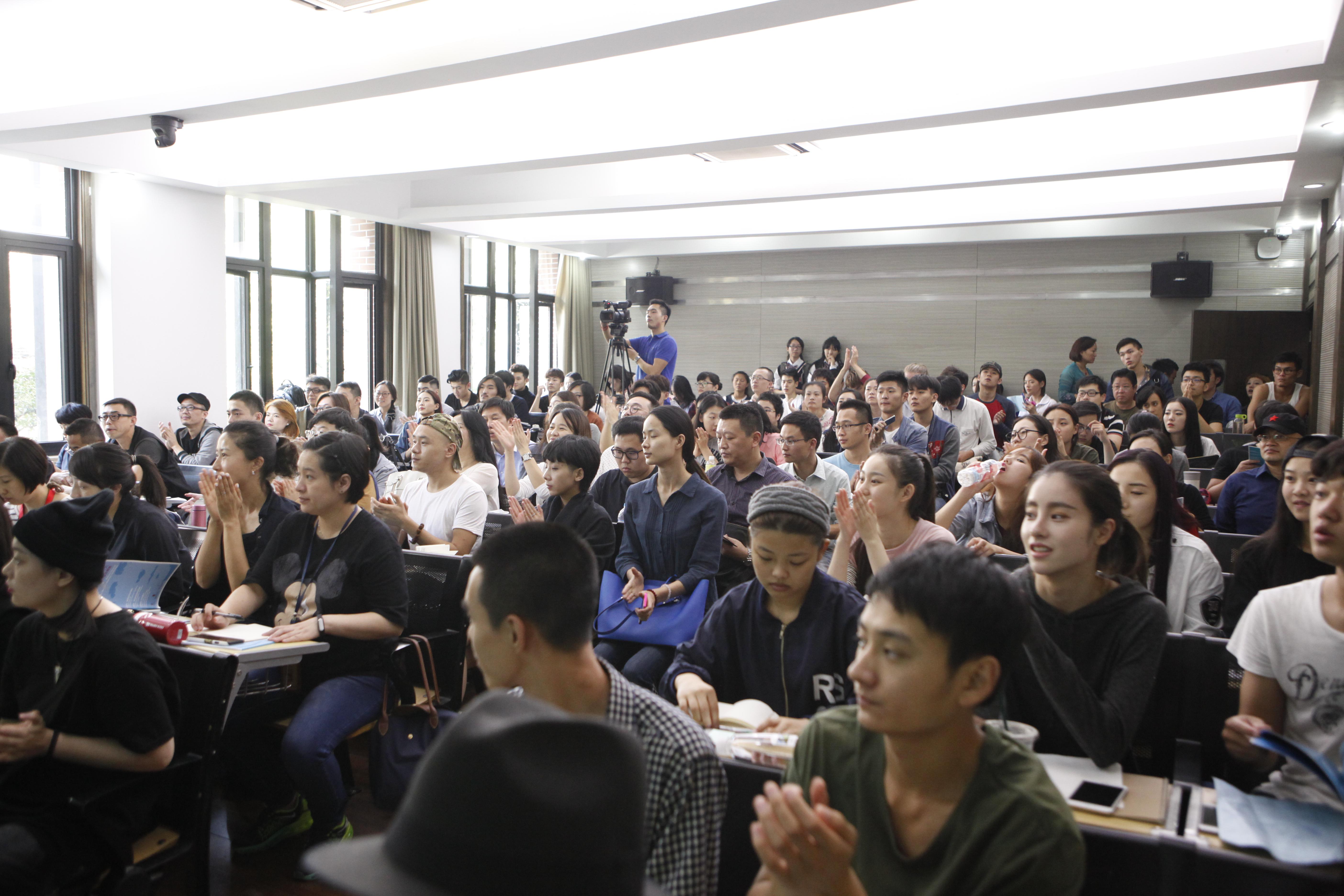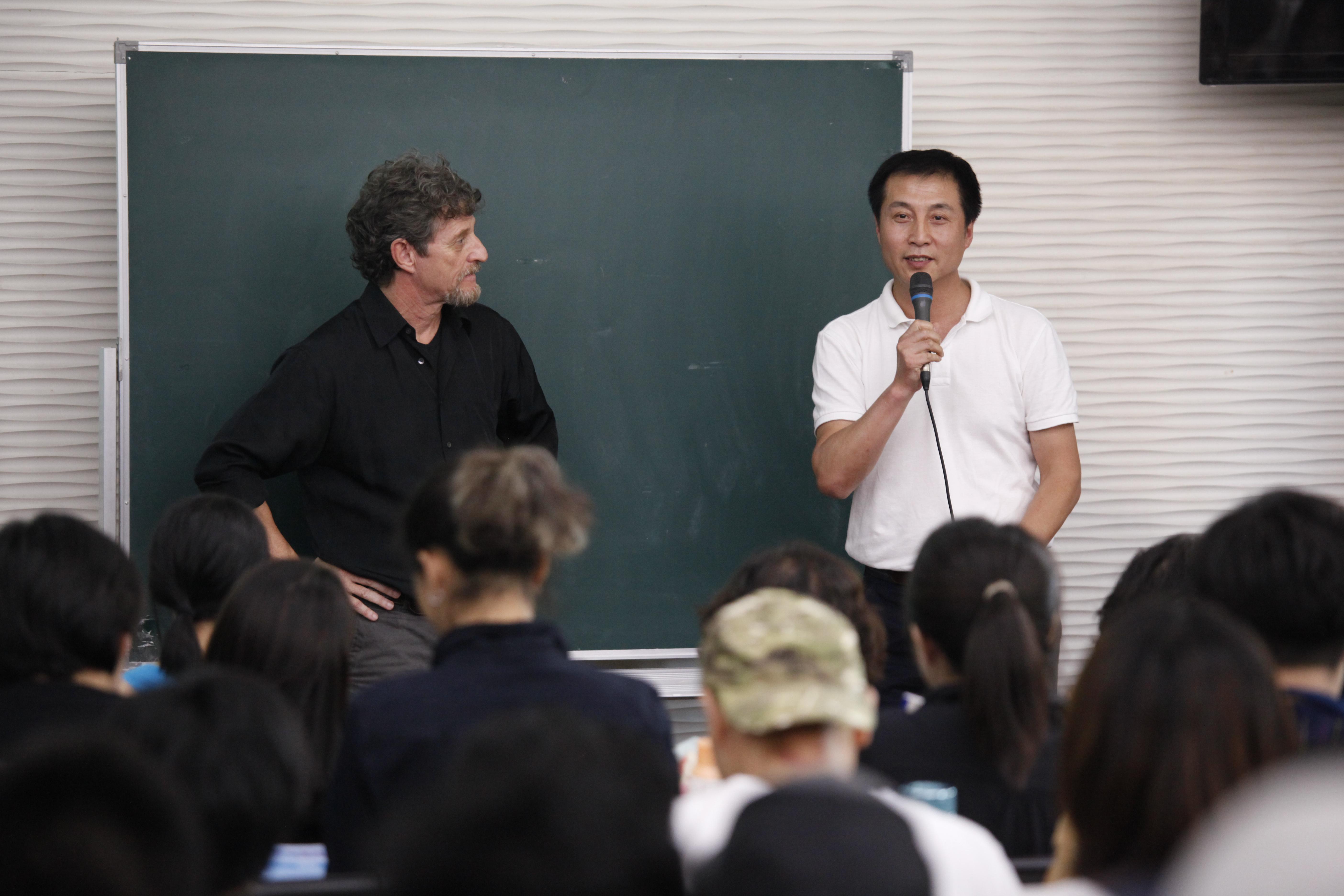 讲座开始前半小时,209教室便已坐满了来自校内校外慕名而来的观众,讲座正式开始时整个教室连过道都坐满了人。讲座一开始,莱纳德·佩蒂特教授首先向大家生动的讲述了迈克尔·契诃夫的生平,接下来莱纳德重点阐述了迈克尔·契诃夫“ 梦幻现实主义”戏剧观;创造性想象力、“双重意识”学说、“气氛”学说、形体动作“四兄弟”、“心理姿势”学说,以及迈克尔·契诃夫方法在教学中的五个指导原则 。莱纳德用简洁又不失诙谐的语言深入浅出地向大家阐述了迈克尔·契诃夫方法的核心。莱纳德表示:他与他的团队更多的是在开发和拓展迈克尔·契诃夫方法并将其分享出去。他说他非常荣幸能够来到上海戏剧学院,并希望更多的人能受益于迈克尔·契诃夫方法。在讲座的最后,上海戏剧学院表演系党支部书记、表演系教学副系主任、国际表演实验教学工作室主持何雁老师幽默地用一位大师班学员的学习心得来表达迈克尔·契诃夫方法的成效:“真的感觉像是来到了魔法学校,我们都是学魔法的人,这几天不断发生神奇的事情,我感到身体里沉睡多年的细胞被唤醒……”在观众热烈的掌声中,讲座圆满结束。