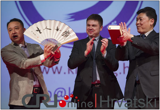 萨格勒布大学孔子学院是本次国家汉办组织的“三巡”欧洲巡演的第一站。展演受到萨格勒布大学的极高重视和当地观众的热烈欢迎。尽管演出当晚恰逢欧洲传统节日万圣节前夜,克罗地亚社会各界人士和当地华侨放弃节日活动,特意赶来参加来自中国上海的戏曲表演和文化交流活动。他们饶有兴致地驻足在“粉墨中国—戏曲普及展”展板前仔细观看,相互交流。能容纳一千余名观众的孔子学院大剧院内座无虚席,现场气氛异常热烈。萨格勒布大学副校长米罗什•尤达施教授,中国驻克使馆赵德勇参赞,上海戏剧学院附属上海戏曲学校副校长侯永强先生以及萨格勒布大学孔院外方院长克拉施米尔•尤拉克出席活动并分别致辞,侯永强副校长代表上海戏剧学院与萨格勒布大学中、外方院长互赠特色礼物。当戏曲学校师生精心准备的《三岔口》、《挂画》、《天女散花》、《游街》和《虹桥赠珠》经典剧目一一亮相,精彩的演出令在场观众深受震撼。演出过程中,观众席中不时传来热烈经久的掌声,更有观众多次离座举起相机,抓拍精彩瞬间。谢幕后热情的观众涌上舞台,争先与演员合影留念。直至散场仍有不少观众意犹未尽,不忍离去。