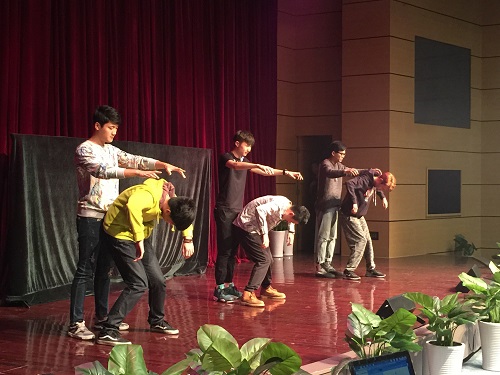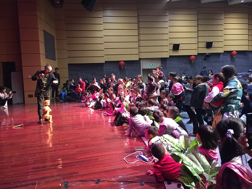 晚上六点,志愿者们结束了病房的公益服务后又来到了儿科医院的报告厅,并且与那里的孩子们一起过集体生日。木偶专业的志愿者们再次上演了精彩的节目:杖头木偶《诚实》教育孩子们诚信做人;创意木偶《魔巾》时而变成鸡斗时而变成舞者;而15级木偶的新生也加入到了志愿者队伍,他们动感的机械舞表演为现场增添了许多热情;人偶剧《乖宝贝》和提线木偶《训猴》更是将气氛推向了高潮,很多孩子都趴到了舞台上观看。最后在孩子们的热烈掌声和欢声笑语中落下了帷幕。