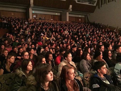 11月6日,第三场交流演出在布拉索夫的特兰西瓦尼亚大学(AULA)礼堂演讲厅举行。虽然演讲台场地不足4米宽,在侯永强团长的带领和亲自示范下,演员们抓紧增减戏份、推敲调整节目。因场地受限,演员出场需经过观众席的台阶,演出所用的刀枪把子备在舞台旁边的三角钢琴的下面。巡演团演员以超强的适应能力,极高的职业标准,每一场都力争奉献给当地观众高水平的艺术享受。当晚8点开始的演出受到观众的热烈欢迎和高度评价。令孔子学院和巡演团意外的是,300度环绕分布的550个座位和一百个加座全部坐满,过道台阶也坐满观众,有的观众站着看完演出。狭小的舞台呈现的是一样的精彩,观众席不时传来雷鸣般持久的掌声。不少观众表示,中国的京剧艺术太震撼了,他们希望下次还能欣赏这样中国传统艺术的盛宴。