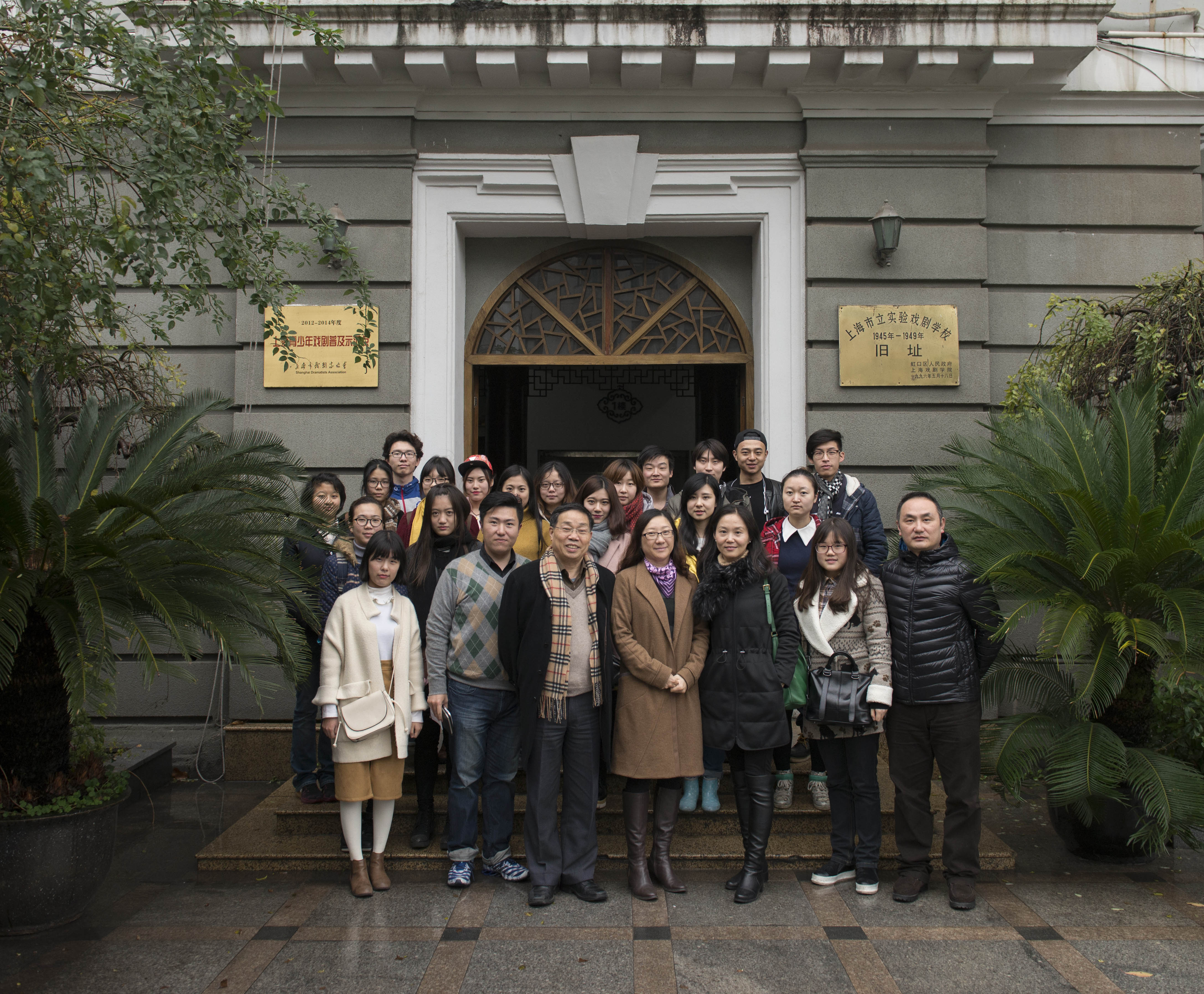 横浜桥老校区的主教学楼,于1915年进行设计规划,1917年建成,虽至今已有近百年历史,但是教学楼仍非常坚固。教学楼内部的装修和格局依旧保留了原有挪威建筑师的设计,有欧式风格。同学们走上旧木板筑造的楼梯,手扶两侧扶手,感受到历史划过的痕迹。教学楼四楼的“蒙艺堂”于1906年建造,1945—1949年上海市立实验戏剧学校期间,成为培养中国优秀艺术人才的摇篮,许多左翼作家和艺术家都在此讲学、演出,梅兰芳、周信芳、盖叫天、田汉、曹禺、洪深也曾在此从事艺术活动。1947年11月7日、8日两天,熊佛西校长亲自在此主办义演活动。“蒙艺堂”也是当年我校老校友们排练的地方,至今新装修的剧场最初的布置格局仍然如初,仅做了一些外部的调整,改造过的剧场现可容纳约380名观众就座。同学们走上舞台,抚摸着墙壁,历史与现在也贯通了一般,仿佛能够看到先辈们在这里勤学苦练,为中国的戏剧和教育事业不断奉献不断探索所做出的努力,大家仔细地看着墙上先辈们的介绍,感激与缅怀之情涌动在心间。