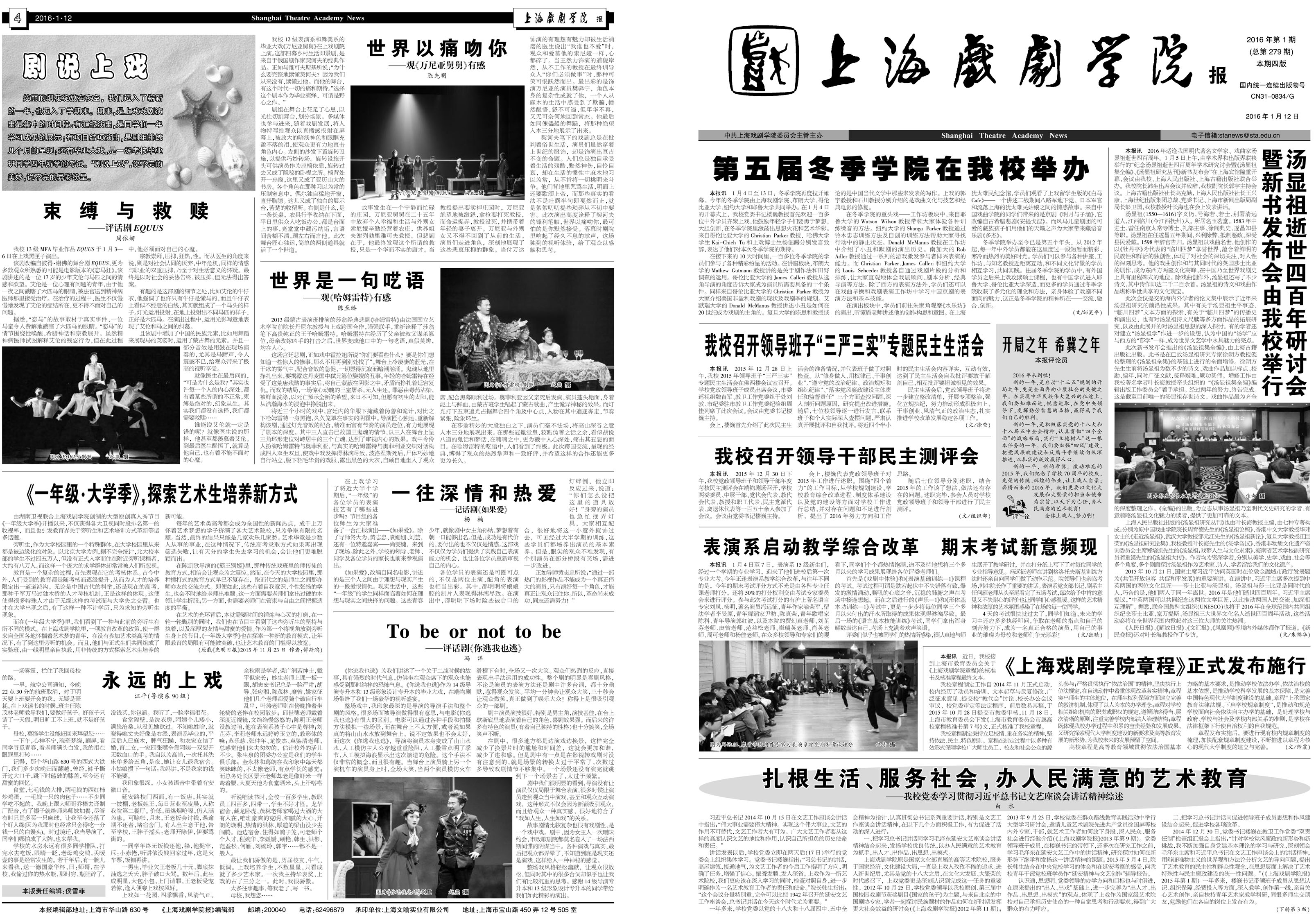 《上海戏剧学院报》2016年第1期(总第279期)已于2016年1月12日出版,本期共四版。重点内容有:《第五届冬季学院在我校举办》、《汤显祖逝世四百年研讨会暨新书发布会由我校举行》、《我校召开领导班子“三严三实”专题民主生活会》、《表演系启动教学综合改革 期末考试新意频现》、《扎根生活、服务社会,办人民满意的艺术教育——我校党委学习贯彻习近平总书记文艺座谈会讲话精神综述》等。敬请关注,也可点击下载阅读。