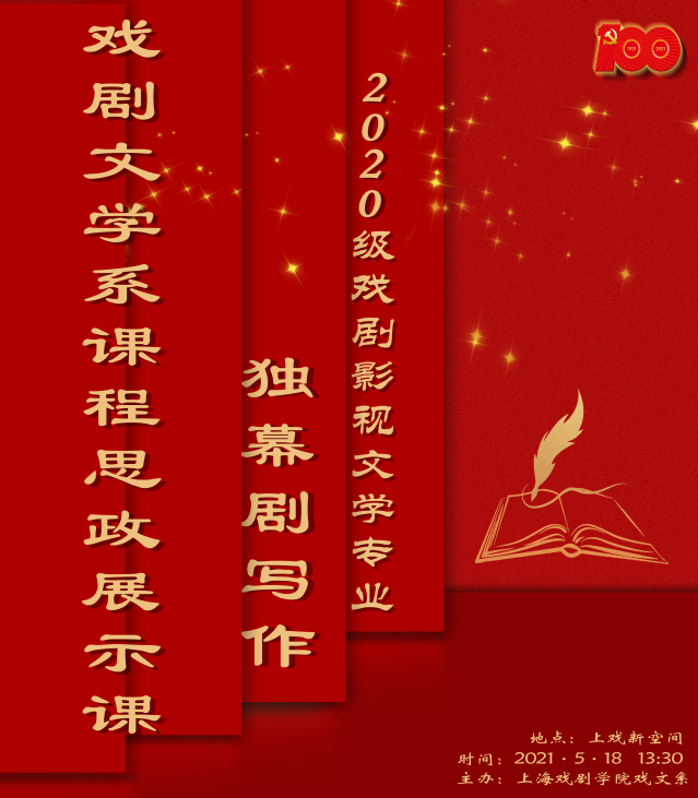 为贯彻落实学校党委关于党史学习教育、将思政教育融入专业课程的工作部署,积极推进课程思政建设、落实立德树人的根本任务,上海戏剧学院戏文系本学期将2020级戏剧影视文学专业《独幕剧写作》课程列为课程思政建设的试点。采用半命题的方式,40名“00后”围绕“红色题材”这一规定主题,以真诚的态度和年轻的视角写下了他们创作生涯中的第一个革命历史作品,阐释了他们眼中的“红色”精神。该课程于2021年5月18日下午在新空间剧场面向全校师生举办了一场课程思政展示课,选取了其中六篇有代表性的独幕剧作品以剧本朗读的形式予以舞台呈现,以此作为教学成果展示,同时也是对中国共产党成立一百周年的致敬与精神赓续。上海戏剧学院副院长唐立兔、戏文系党支部书记张璟、戏文系主任陈军等院系领导出席了此次展示课。