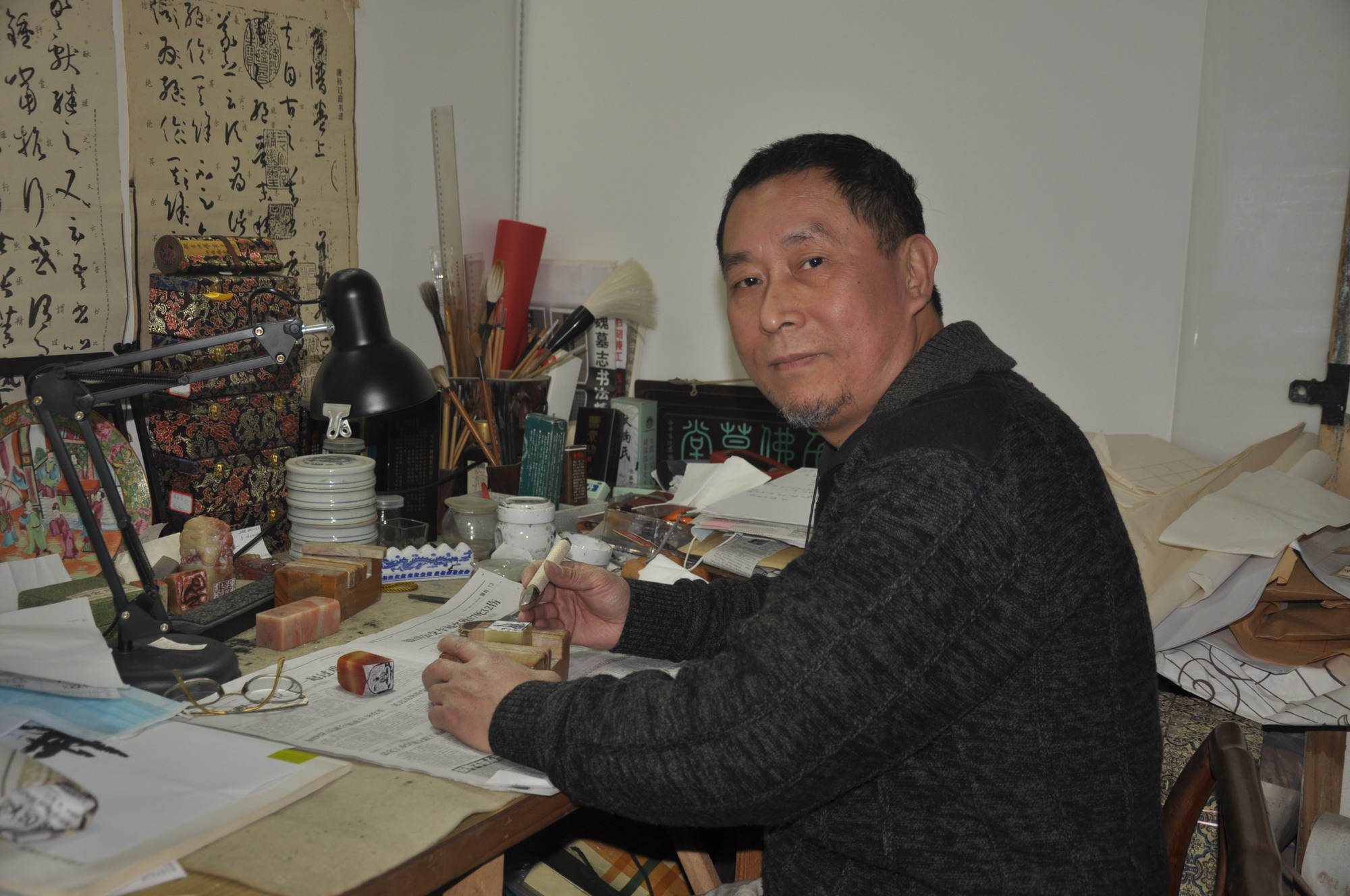 走进沈府千佛草堂,凡走廊、客厅、卧室、厨房全都放着印石,工作室走进去都困难;刻好的砖印实在摆不下,只好塞进卫生间;戏曲人物、佛像的设计稿有几个笔记本——他对篆刻一往情深,且不说在书法、绘画领域的追求与成绩了。沈鼎雍扎根上海戏剧学院四十年,不喜应酬,也没有一官半职,大部分时间都花在艺术上。他的勤奋令人吃惊,虔诚如苦行僧,用功程度甚至超过许多职业书法篆刻家。沈鼎雍的篆刻实践应了一句老话“天道酬勤”,由于生性内向、不事张扬,他的肖形印成就尚未被业界同行充分认知。在时间的推移中,浮华喧嚣渐渐散去,成果沉淀下来,沈鼎雍的艺术创新自会得到公允的评价。