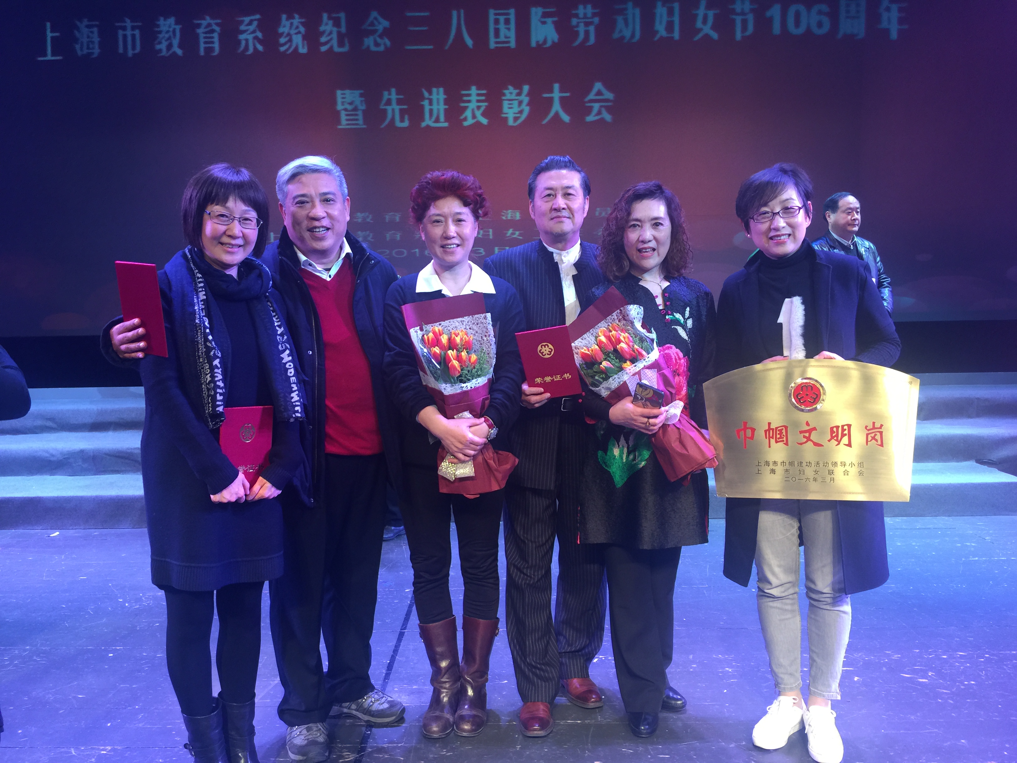 据悉,我校“妇女之家”荣获2015年度上海市教育系统“妇女之家”示范点称号,国际交流中心荣获上海市巾帼文明岗称号,财务处荣获上海市教育系统巾帼文明岗称号,赵群荣获上海市教育系统巾帼建工标兵称号,王苏、刘宁荣获上海市教育系统比翼双飞模范佳侣标兵称号,李莉、佟瑞敏荣获上海市教育系统比翼双飞模范佳侣称号。