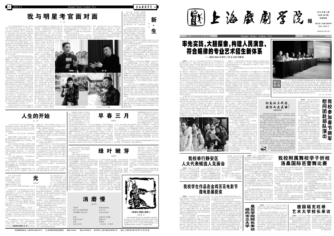 《上海戏剧学院报》2016年第2期(总第280期)已于2016年3月5日出版,本期共四版。重点内容有:《率先实践,大胆探索,构建人民满意、符合规律的专业艺术招生新体系——我校2016年招生工作正式拉开帷幕》、《我校参加春节拥军慰问团赴部队演出》、《我校举行静安区人大代表候选人见面会》、《我校学生作品在金鸡百花电影节微电影展获奖》、《我校附属舞校学子折桂洛桑国际芭蕾舞比赛》等。敬请关注,也可点击下载阅读。(文、图、编辑:榕树)
