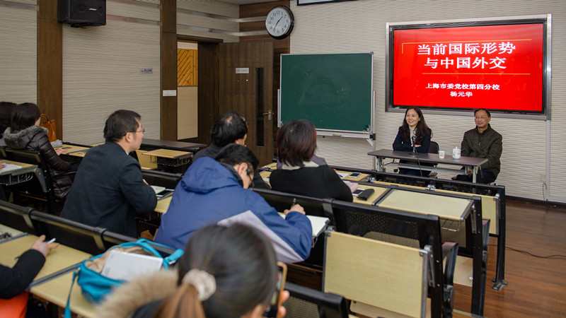 杨元华教授以《当前国际形势与中国外交》为主题,为在座党员同志讲解了当前国际形势的特点、中国外交的方针政策,以及中美关系、中俄关系、中日关系等一系列政治热点问题。杨元华教授指出,当前国际形势的特点是经济全球化、政治多极化、国际关系民主化、发展模式多样化、安全威胁复杂化。中国外交的方针政策在于:发展中国家是基础、大国是关键、周边是首要、多边是舞台。