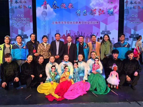 为进一步推动中华优秀文化的培育、传承和创新,搭建文化交流桥梁,凝聚中华文化认同,推动民族团结进步,4月17日至23日,2016上海大学生文化志愿者赴四川开展交流巡演活动。此次活动由上海市教育卫生工作委员会、上海市教育委员会主办,由我校承办。短短几天中,大学生文化志愿者先后赴都江堰、阿坝州、成都市进行三场演出,在彰显大学生“青春放歌”风采的同时,也充分展示了上海教育的丰硕成果,展示了上海大学生心系祖国的使命情怀。市教卫党委副书记、市教委副主任高德毅,我校党委书记楼巍、副院长张伟令到场观看。我校选送了木偶《玉兰飘香》、京剧《金猴借扇》,与上海视觉艺术学院合作演出了造型秀《着色》三个节目,演出过程中掌声不断,获得了当地观众的好评和赞誉。