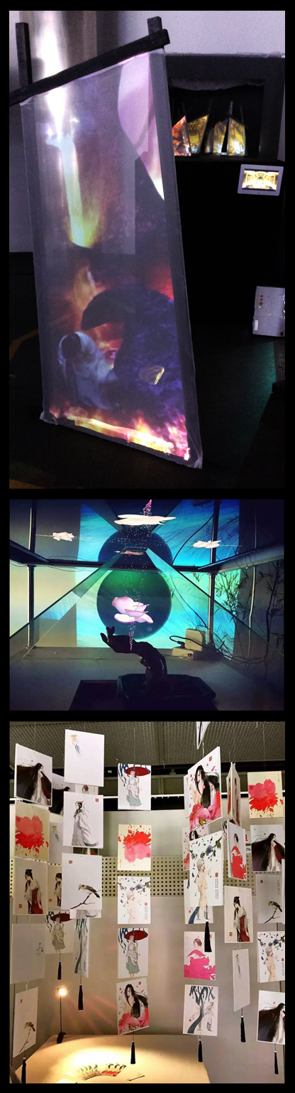 基于这个定位,这一专业有一项重要的学习内容便是新媒体戏剧投影设计。此次展览中有一批以《聊斋志异》故事为蓝本的新媒体戏剧投影设计作品,便鲜明地体现了媒体创意的基本专业特色。这些设计主要利用影像投影的手段,突破传统戏剧的束缚,将中国古典故事与数字化表现手法相结合。同学们自己制作舞台投影影像,这些影像除了基本的特效制作外,还进行了绿棚拍摄,后期将演员的表演合成在特效画面中,使展览中的影像效果更为流畅、直观,利用影像与演员的虚实结合,打破了传统戏剧舞台的时间与空间感,试图打造“出神入化”的舞台效果。