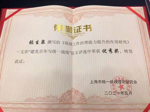 由我校党委宣传部原部长、上海市教委特聘教师人文修养培养专家张生泉教授撰写的《统战工作治理能力提升的作用研究》在上海市统一战线理论研究会举行的建党百年与统一战线”征文中获优秀奖。