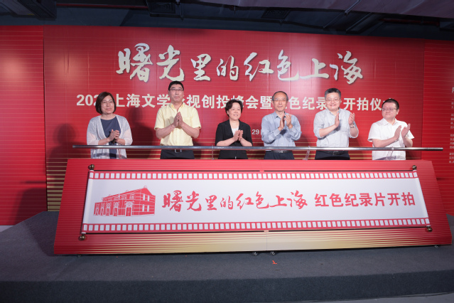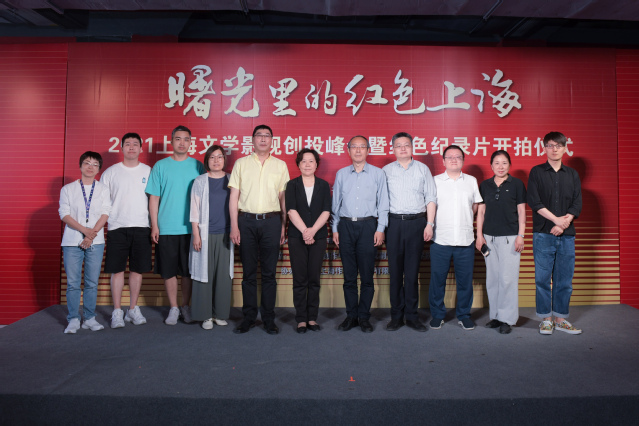 紧接着,由本次活动的主办方上海市作家协会、上海戏剧学院,承办方上海文学创作中心、上海戏剧学院电影学院和协办方上海作家俱乐部有限公司的领导、嘉宾们上台,共同启动本次开拍仪式的红色画卷。在热烈的掌声之中,“曙光里的红色上海——2021上海文学影视创投峰会暨红色纪录片”正式宣告开拍。