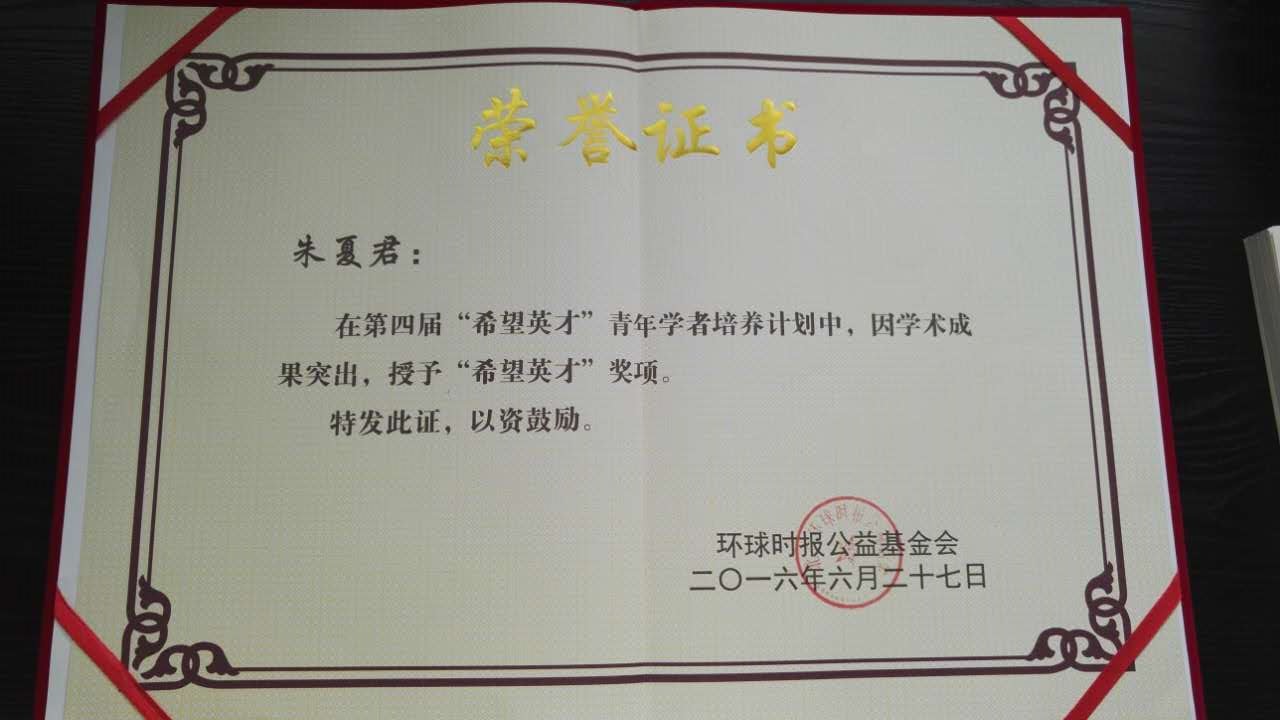 6月27日,第四届环球时报“希望英才”青年学者培养计划颁奖典礼在北京举行。“希望英才”青年学者培养计划是环球时报公益基金会在教育领域运作的一项公益项目,目标是为国家“养士”。项目经过论文的征集、初审、筛选、讨论、评定等环节,给予国内从事人文社科类研究和教学的优秀青年学者以经济支持。该计划于2012年12月正式启动,至今已成功举办四届。2016年,复旦大学、中国社会科学院等高校和科研机构的10位从事人文社科类研究和教学的青年学者获得了资助。我校青年教师朱夏君成为社科类获奖的青年教师。(文、图:宣传 编辑:榕树)