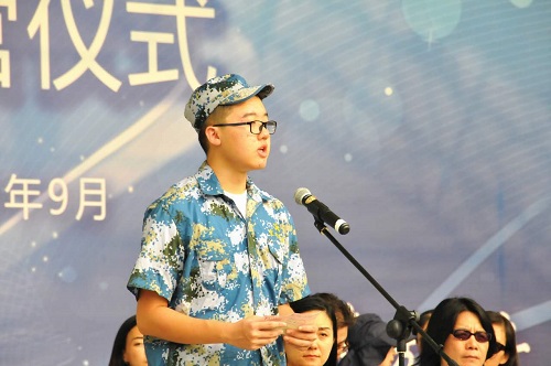 之后,电影电视学院2016级新生伊博代表全体参训学生发言,面对第一次在这么多人面前讲话的挑战,他领悟到学习艺术要敢于面对新的挑战,想自己曾经不敢想的东西,他表示在接下来的七天军训中要和全体新生一起吃苦耐劳、团结互助,共同度过这段生命中不可复制的美丽旅程。