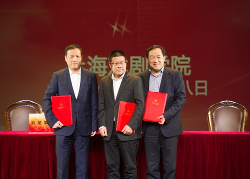 上海戏剧学院院长黄昌勇、阿里巴巴影业集团CEO张强、复星集团副总裁李海峰代表三方签署了战略合作协议。