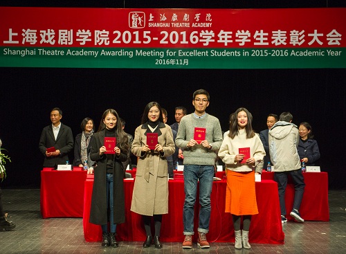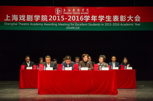 2016年11月24日下午,上海戏剧学院2015—2016学年学生表彰大会在华山路校区端钧剧场举行。校领导黄昌勇、胡敏、张伟令、张佳春,以及各院系领导参加大会并为荣获各类集体和个人奖项的学生代表颁奖。大会由党委副书记胡敏主持,学工部、院系辅导员老师以及获奖同学代表在主席台下就坐。
