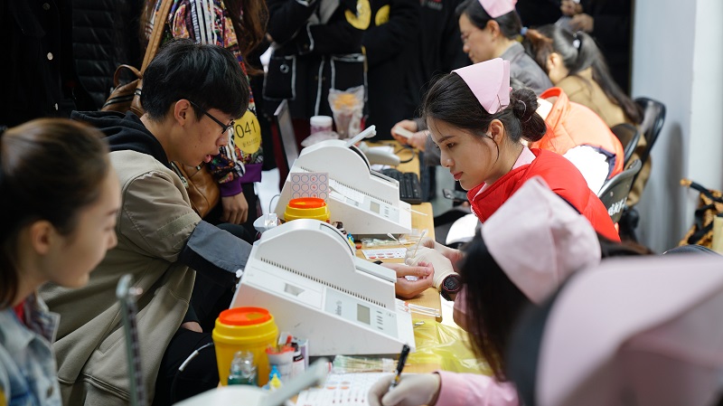 献血活动从上午8:30开始,两个校区的同学们有序排队前来献血。同学们在志愿者的指引下,前往采血处,依次参加献血前的体检。学生志愿者们不厌其烦地向每一位献血的同学嘱咐着献血注意事项,他们亲切的笑容稀释了同学们献血前的紧张情绪。献血的同学撸起袖管依次排队走上献血车,其中不少人已经不是第一次参加无偿献血了,当年轻的血液流入细管时,这不仅仅是生命的延续,更是一份沉重的社会责任感。整个献血环节组织有序、进展顺利。