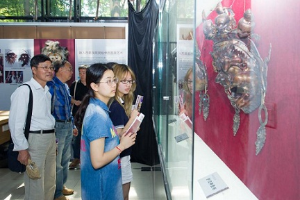 观众驻足欣赏来自雪域高原的面具艺术 刘佳奇 摄