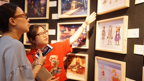 观展过程中,学生们热情地向来宾介绍了自己的创作初衷、创作过程,使参观者在全面了解作品的同时,更感受着学生的创作激情。数字媒体艺术专业的学生们展出了各种舞台投影装置,打破传统,致力于将新媒体艺术融入其中。视觉传达艺术专业的学生们在展现与时俱进且制作精美的产品包装设计同时,还展示了具有个人思想深意的摄影作品。动画方向的学生们不仅展出了丰富的角色设计和场景设计作品,也将定格动画作品呈现在了屏幕上,脑洞大开的定格动画和模型赢得了参观嘉宾的赞许。
