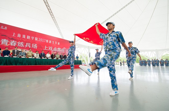 结营式在升国旗、奏唱国歌的仪式中正式开始。党委书记楼巍在东方绿舟党总支书记杨昕的陪同下检阅了17级新生受训连队。在分列式行进过程中,由中国人民解放军三军仪仗队的三名教官带领24名护旗手组成的军旗护旗组护卫着八一军旗,走在最前面,接着是四名新生代表高高举起上海戏剧学院校旗紧随其后,10个受阅方阵依次通过主席台,接受了校领导和院系领导老师们的检阅。
